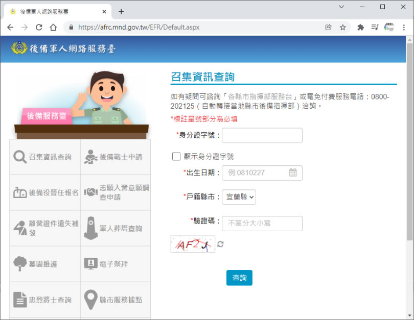 首頁線上工具生活資訊 如何在「後備軍人網路服務臺」查詢年度教召資訊? 後備軍人原本是每 2年召訓一次,明年( 111年 )起將試行「1年 1召、訓期 14天」號稱史上最硬的教召新制,而人員選訓方式採「後退先用」為原則,並針對 8年教召未滿 4次的後備軍人,將原「編管 8年」的政策放寬至「退伍 12年」,至於自己有沒有被納入年度內預計選訓人員,自 110年 12月 1日起,可在後備軍人網路服務台網站,輸入身分證字號、出生日期以及戶籍縣市就可以查詢最新教召資訊。 🔔 不錯過任何精彩! 立即訂閱我們的 LINE 官方帳號 每次發佈新文章時,您將會第一時間收到本站文章連結通知,輕鬆掌握最新資訊! 使用 LINE 追蹤文章更新 §相關文章,還可以參閱:Apple Music 台灣新用戶優惠:6個月免費暢聽,領取方式與限制一次看!2026春節追劇清單!Netflix 2月必看攻略:燒腦推理、火爆動作片,陪你從初一爽追到開工!459 萬人搶 60 萬份!運動幣中獎號碼公布,快查你的身分證尾數都馬一起GO!LINE GO新年優惠最高拿$800優惠券,還有一個月乘車金等你抽過年搭高鐵自由座要排多久?看LINE就知道 台灣高鐵×LINE TODAY推出春節限定燈號預估服務 如何在「後備軍人網路服務臺」查詢年度教召資訊? 1.使用瀏覽器進入「後備軍人網路服務臺」,按[ 召集資訊查詢 ]。 2.以[ 使用個人資料登入 ]為例,填入相關資訊。 3.按[ 查詢 ]就會出現結果了。 4.「教育召集」只是召集中的一項,還有「動員召集」、「臨時召集」與「勤務召集」,具體可見召集類別 5.至於後備軍人屆滿服役限齡除役年次,可參閱:110年後備軍人屆滿服役限齡除役年次公告 國防部後備指揮部網站網址:https://afrc.mnd.gov.tw/EFR/Default.aspx