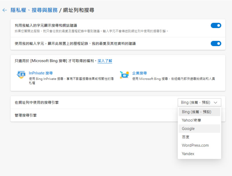 首頁操作技巧瀏覽器 [ Edge ]如何更改預設的搜尋引擎? Chrome 與 Edge 都是利用 Chromium 為核心架構所發展出的瀏覽器,但各有各的優缺點,如果能夠互補長短相信會更好,例如 ,晚起家的 Edge 也可以去安裝 Chrome 線上應用程式商店內的擴充功能 ,又或是 Edge 預設使用自家的 Bing 搜尋引擎,我們同樣可以更改成自己慣用的搜尋引擎,例如 Google、Yandex、Yahoo 或百度...等等,如此一來,愛用 Edge 的使用者,也不需要搜尋關鍵字時開 Chrome 來搜尋,其他作業又轉往 Edge 的切換。 🔔 不錯過任何精彩! 立即訂閱我們的 LINE 官方帳號 每次發佈新文章時,您將會第一時間收到本站文章連結通知,輕鬆掌握最新資訊! 使用 LINE 追蹤文章更新 §相關文章,還可以參閱:如何在 Chrome 中顯示 / 隱藏 AI 模式按鈕?flags 設定教學Google AI 模式正式支援繁體中文:一次搞懂功能、應用與影響Edge 不用開側邊欄!網址列直接輸入提示詞就能 AI 生圖與搜圖Edge、Chrome 瀏覽器複製已開分頁到新分頁,這招你一定要學起來Edge Android 版新增底部網址列功能,來看怎麼設定 [ Edge ]如何更改預設的搜尋引擎? 1.開啟 Edge 瀏覽器的設定頁面。 2.切換到[ 隱私權、搜尋與服務 ]頁籤,找到網址列和搜尋。 3.接下來我們就可以變更成我們管用的搜尋引擎。 4.完成變更後會出現[ 使用搜尋方塊或網址列在新索引標籤上搜尋 ]選項。 5.,[ 搜尋方塊(建議使用)]意思是指在網址列輸入的使用變更後的搜尋引擎,而分頁 Microsoft 下的搜尋框還是會使用 Bing;如果選擇[ 網址列 ],則微軟 Logo 下輸入關鍵字時,會直接跳到網址列。 6.如果沒有自己慣用的搜尋引擎也可以自己新增。
