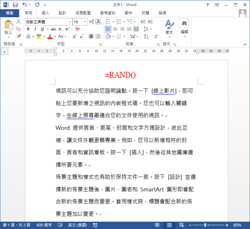 1.Excel 中的 RAND 函式是用來產生隨機數字,而在 Word 中則是用於產生隨機文字,其用法為 =RAND(1,2),1 為可選參數,作用是隨機產生段落數; 2 同樣為可選參數,其作用為產生行數,如果輸入 =RAND() 後,按鍵盤 Enter 鍵,則隨機產生段落及句子。