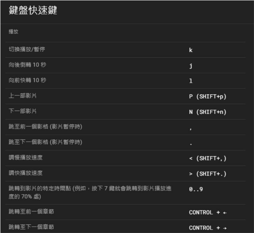 首頁操作技巧Google 善用 YouTube 鍵盤快速鍵,調整影片播放速度、開關字幕與操作全景影片 YouTube 是目前最受歡迎的影音平台,不但有與有線電視同步播出的新聞頻道可看,更有數以萬計的創作者從各種題材與自身角度所拍攝出的影片,內容相當豐富與多元,且不論是電視、電腦、平板或手機等設備,只要有空閒時都可以觀看,如果使用電腦觀看 YouTube 影片,為了讓欣賞影片可以更順暢,我們可以學習幾個在觀看 YouTube 影片時會常用到的鍵盤快速鍵,例如影片播放速度的調整、切換章節或適切換到上、下一部影片等等,避免在全螢幕觀看時還需要切換再使用滑鼠來操作。 🔔 不錯過任何精彩! 立即訂閱我們的 LINE 官方帳號 每次發佈新文章時,您將會第一時間收到本站文章連結通知,輕鬆掌握最新資訊! 使用 LINE 追蹤文章更新 §相關文章,還可以參閱:別再只會用兩指縮放 Google 地圖了!這些隱藏手勢讓你效率翻倍照著做就會!Google 官方釋出 NotebookLM 簡報製作的 8 種範例教學機車族專屬!Google Maps 推出 5 款超萌機車圖示 × 8 種顏色,設定步驟看這篇Google Skills:3000+ 門課程助你打造 AI 時代競爭力Google Vids 全解析:一文看懂功能、免費版限制及完整操作步驟 如何使用 YouTube 鍵盤快速鍵,調整影片播放速度、開關字幕與操作全景影片? 1.有哪些 YouTube 鍵盤快速鍵可以操作呢?我們可以在 YouTube 頁面按右上角的使用者圖示 > 鍵盤快速鍵找到。 2.鍵盤快速鍵被區分為播放、一般、字幕及全景影片四大項。