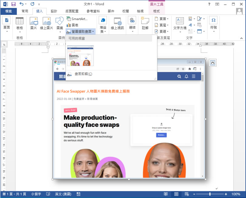 首頁操作技巧Word [ Word ]如何快速擷取螢幕畫面? 編輯 Word 文件過程中,如果需要用到某個應用程式的畫面,例如製作應用程式的教學文件,或是需要用到 Windows 桌面的畫面,甚至是某個網頁的頁面,通常我們都會先擷取成圖片後再將圖片貼回編輯器中,這樣來回的切換實在很麻煩,而在 Word 中,這樣的麻煩只要善用插入功能表中的螢幕擷取畫面功能,就能輕鬆解決,且擷取出來的圖片還可以利用 Word 內建的圖片工具進行壓縮、校正、色彩調整與加入樣式、效果等,讓製作這類的文件也可以很輕鬆地完成。 🔔 不錯過任何精彩! 立即訂閱我們的 LINE 官方帳號 每次發佈新文章時,您將會第一時間收到本站文章連結通知,輕鬆掌握最新資訊! 使用 LINE 追蹤文章更新 §相關文章,還可以參閱:「Word」如何讓「貼上」動作僅保留文字而不保留原有格式設定?如何直接開啟儲存在網路上的 Word、Excel 或 PDF 檔案?[ Word ]如何使用 RAND 函數,快速產生隨機中、英文字盲文?[ Word ]如何製作具有開啟密碼保全的 PDF 檔案?[ Word ]如何將頁面上下或左右平均分成兩半? [ Word ]擷取螢幕畫面步驟 1.先開啟要擷取畫面的應用程式,例如瀏覽器內的網頁畫面。 2.回到 Word 編輯器, 在上方功能表選擇[ 插入 ] > [ 螢幕擷取畫面 ],就可以選擇要插入編輯器內的縮圖。 3.插入後,可以利用圖片工具進行修飾。 4.如果是要擷取螢幕的某一範圍,例如桌面或應用程式視窗,可以使用[ 畫面剪輯 ]功能,自行圈出所要擷取的範圍。
