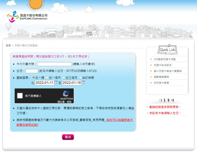 首頁線上工具生活資訊 如何線上查詢悠遊卡餘額及使用紀錄? 悠遊卡使用的範圍廣泛,加上取得的管道也相當容易,因此,常會造成滿手的悠遊卡,要消費的時候,卻不知道卡上餘額,或是家長想知道小朋友悠遊卡的消費紀錄等,為查詢這些事項,很多人會跑到便利商店請店員幫忙,但,其實不用這麼麻煩,只要透過瀏覽器進入悠遊卡公司的的線上歷史交易查詢,輸入卡號,如果有記名,再多加輸入生日,便可以將該卡號的餘額及其當日之前 3天至前 1年的交易記錄通通列出。 🔔 不錯過任何精彩! 立即訂閱我們的 LINE 官方帳號 每次發佈新文章時,您將會第一時間收到本站文章連結通知,輕鬆掌握最新資訊! 使用 LINE 追蹤文章更新 §相關文章,還可以參閱:Apple Music 台灣新用戶優惠:6個月免費暢聽,領取方式與限制一次看!2026春節追劇清單!Netflix 2月必看攻略:燒腦推理、火爆動作片,陪你從初一爽追到開工!459 萬人搶 60 萬份!運動幣中獎號碼公布,快查你的身分證尾數都馬一起GO!LINE GO新年優惠最高拿$800優惠券,還有一個月乘車金等你抽過年搭高鐵自由座要排多久?看LINE就知道 台灣高鐵×LINE TODAY推出春節限定燈號預估服務 如何線上查詢悠遊卡餘額及使用紀錄? 1.使用瀏覽器進入「悠遊卡歷史交易查詢」 網頁,按其要求輸入相關資訊,並勾選[ 我不是機器人] 選項,便可以順利查詢。 2.如果不記得是不是記名卡,[ 送出 ]查詢後會有提示。 3.查詢結果會顯示加值、交易場所、扣款及餘額等資訊。 4.其他的查詢管道,也可以在悠遊卡公司官網得知。 悠遊卡歷史交易查詢網站網址:https://ezweb.easycard.com.tw/search/CardSearch.php
