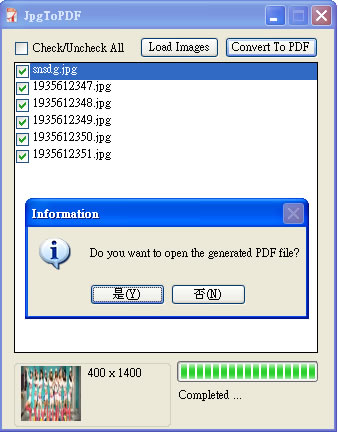 首頁電腦軟體檔案管理 JPEGToPDF 將 JPEG 圖檔格式轉換成 PDF 文件﹝免安裝﹞ JPGToPDF 是一套可以將 JPEG 圖檔格式批次轉換成 PDF 文件的免費軟體,操作上非常簡單,只要將要轉成 PDF 的 JPEG 或 JPG 圖檔加入,點擊[Convert To PDF]就可自動生成一份 PDF 文件。 🔔 不錯過任何精彩! 立即訂閱我們的 LINE 官方帳號 每次發佈新文章時,您將會第一時間收到本站文章連結通知,輕鬆掌握最新資訊! 使用 LINE 追蹤文章更新 §相關文章,還可以參閱:檔案好多重複怎麼辦?免費 dupeGuru 幫你一鍵清出電腦空間[ 免費使用 ]PDFgear 整合各種 PDF 工具,具格式轉換、編輯、合併或拆分等功能7-Zip 檔案壓縮與解壓縮免費軟體AmoK Exif Sorter 讓照片按拍照日期重新命名並自動分類的免費軟體PDF Unshare 限制 PDF 檔案的讀取有效日期 如何使用 JPGToPDF ? 1.下載解壓縮後,執行「jpegtopdf.exe」便可開啟。 2.點擊[Load Images],將要轉換的 JPG 或 JPEG 圖檔批次加入後,點擊[Convert To PDF],給予 PDF 檔案名稱後,便會開始轉換。 3.轉換完成後,使用 PDF 閱讀器開啟。 JPGToPD版本:1.0語言:英文性質:免費適用:Windows官方網站:http://code.google.com/p/jpgtopdfconverter/下載:按我下載 | 備用下載點
