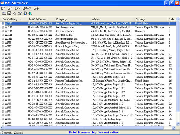 首頁電腦軟體網路應用 MACAddressView 查詢網卡 MAC Address(免安裝) 每台電腦網路卡的 MAC Address 都是獨一無二的,若想知道自己電腦的 MAC Address 或是想知道電腦生產廠商所分配到的 MAC Address,可以使用 MACAddressView 這套免費軟體來進行查詢,MACAddressView 除了提供可查詢自己電腦的 MAC Address 之外,也提供可使用電腦生產廠商、地址或國家來進行查詢 MAC Address 分配狀況。 🔔 不錯過任何精彩! 立即訂閱我們的 LINE 官方帳號 每次發佈新文章時,您將會第一時間收到本站文章連結通知,輕鬆掌握最新資訊! 使用 LINE 追蹤文章更新 §相關文章,還可以參閱:Bright VPN 提供覆蓋全球60多個位置的免費 VPN服務WhoisThisDomain 網域名稱註冊資料免費查詢工具PingInfoView 可自訂時間 PING 自訂的 IP 或網域並發出通知Wireless Network Watcher 找出有哪些裝置正在連你的無線網路IPNetInfo IP 資訊查詢工具 如何使用 MACAddressView ? 1.下載解壓縮後,執行「MACAddressView.exe」便可開啟。 2.開啟後,若想知道自己電腦的 MAC Address,可點擊[My MAC Addresses]。 3.若想查詢電腦生產廠商所分配的 MAC Address,可使用[Company Name]進行查詢。 4.輸入電腦生產廠商名稱,例如 ACER 、ASUS 等,輸入好之後,點擊[OK]。 5.接下來便會列出分配狀況。 6.若想匯出成其它格式進行儲存,可點擊[View] >[HTML Report - All Items](所有項目) 或 [HTML Report - Selected Items](所選項目)。 MACAddressView版本:1.48語言:英文性質:免費適用:Windows官方網站:https://www.nirsoft.net/utils/mac_address_lookup_find.html下載:按我下載