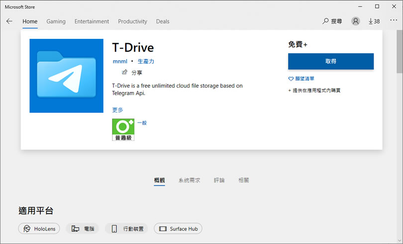1.有了 Telegram 帳戶,我們就可以使用瀏覽器瀏覽到 Microsoft Store 安裝 T-Drive 應用程式 頁面,按[ 取得 ]。
