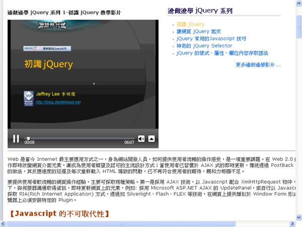 首頁線上工具開發工具 微軟 MSDN 學習園地「邊做邊學」系列影片,包含 jQuery、Web Application Toolkit、雲端運算、PHP等共 12 個系列 想學習程式開發最速成的方式就是邊做邊學,也許寫的當初根本不知道寫的這行程式碼有甚麼作用,但隨著時間累積,寫程式功力逐漸增加,也會成為一名程式設計的高手。微軟 MSDN 學習園地的「邊做邊學教學系列」是一系列以實例說明為主,佐以中文 Silverlight 教學影片為輔的系列課程,帶領您由入門開始,深入淺出介紹各式主題的基本知識,讓初學者能充分融會貫通,只要 20 分鐘,簡單輕鬆就能秀出讓人驚豔的成品。「邊做邊學教學系列」包含有 Marketplace for Mobile、雲端運算 (Windows Azure Platform)、Facebook、Web Application Toolkit、IIS Smooth Streaming、XBOX 遊戲開發、PHP 漫步在雲端、Windows Mobile Widget、PHP on Windows、Silverlight、Internet Explorer 8、jQuery 等系列課程。 🔔 不錯過任何精彩! 立即訂閱我們的 LINE 官方帳號 每次發佈新文章時,您將會第一時間收到本站文章連結通知,輕鬆掌握最新資訊! 使用 LINE 追蹤文章更新 §相關文章,還可以參閱:網站效能健檢免費工具!PageTest 多裝置模擬效能分析及由 AI 提出改進建議Regex-Vis 圖解正則表達式的線上工具,可編寫還可驗證Sitemap Generator:線上快速產生符合 SEO 標準的網站地圖,無網址數量限制適用各類型網站網站隱私權政策產生器 Privacy Policy Generator:輸入網站名稱和網址即可輕鬆生成專屬條款Frame0:輕鬆繪製應用程式流程圖、UML 和介面雛形的免費工具,適用於 macOS 與 Windows 如何使用 微軟 MSDN 學習園地「邊做邊學」系列影片? 1.進入微軟 MSDN 學習園地「邊做邊學」系列影片網站後,可根據需要選擇課程系列。 2.例如想要學習 jQuery 如何應用在 ASP.NET 上,可點擊[jQuery],接下來就會跳到 jQuery 系列,從最基礎的認識jQuery 開始到完成一個網頁應用程式完整系列。 3.點擊感興趣的課程,便會開始播放。 微軟 MSDN 學習園地「邊做邊學」系列影片網站網址:http://msdn.microsoft.com/zh-tw/dd310332.aspx