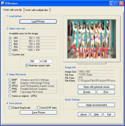 首頁電腦軟體影像繪圖 PIXresizer 可批次轉換圖檔格式及重設圖檔尺寸大小的實用工具 PIXresizer 是一套可以單張或批次轉換圖檔格式及重設圖檔尺寸大小的免費工具軟體,所支援的格式有 BMP、GIF、JPEG、PNG 及 TIFF 等圖檔格式,除了圖檔格式轉換之外,也可以產生圖片縮圖,PIXresizer 內建多種預設的圖片長寬設定,也可自訂圖片縮放尺寸。 🔔 不錯過任何精彩! 立即訂閱我們的 LINE 官方帳號 每次發佈新文章時,您將會第一時間收到本站文章連結通知,輕鬆掌握最新資訊! 使用 LINE 追蹤文章更新 §相關文章,還可以參閱:告別訂閱制!Canva 旗下 Affinity 永久免費,向量設計、影像處理、排版工具全面開放Pineapple Pictures 載入速度超快的相片檢視器(免安裝)PhotoResizerOK 可快速調整圖片尺寸的免費軟體ShortDoorNote 將輸入的文字快速轉成圖片Bzzt! Image Editor 圖片批次壓縮、轉檔及尺寸調整的免費工具 如何使用 PIXresizer? 1.下載解壓縮後,進行安裝,安裝完成後,開啟「PIXresizer」主程式,主介面區分兩個頁籤,第一個適用來處理單張相片而第二個頁籤則是用來批次處理,在[Work with one file]頁籤中,點擊[Load Picture]將要轉換的圖檔載入 PIXresizer 內。 2.在 Select New Size 處,選擇要縮圖的比例,若都沒有合適的內建選項,也可以選擇 Custom size 來輸入所圖尺寸,選擇好之後,在 Select file format 處,選擇要輸出的圖檔格式,選擇好之後,點擊[Save Picture]選擇要將檔案存放的路徑後,即可完成轉換。 PIXresizer版本:2.0.8語言:英文性質:免費適用:Windows官方網站:http://bluefive.pair.com/pixresizer.htm下載:按我下載
