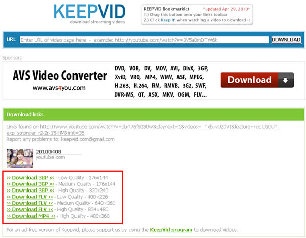 首頁線上工具上傳下載 KEEPVID 線上簡單又實用的 YouTube 影片下載 有很多的 YouTube 影片下載工具,不管是線上服務、特定瀏覽器外掛 YouTube HD Suite 還是專門下載軟體 Moyea YouTube FLV Downloader 、TubeMaster++ 及 Free Download Manager 或是影音播放器內建的下載網路影片 Miro、VLC Media Player 及 KMPlayer。KEEPVID 是一個線上簡單又實用的 YouTube 影片下載的免費服務網站,只要輸入YouTube 影片的 URL 網址,便會列出目前該影片所提供的影片格式,例如 3GP、MP4 或是 FLV 等,點擊後便可下載。 🔔 不錯過任何精彩! 立即訂閱我們的 LINE 官方帳號 每次發佈新文章時,您將會第一時間收到本站文章連結通知,輕鬆掌握最新資訊! 使用 LINE 追蹤文章更新 §相關文章,還可以參閱:M3U8 Player:本地瀏覽器處理,播放、下載、轉 MP4 一站免費完成getM3U8 免費線上工具:輕鬆下載 M3U8 串流影片並轉檔 MP4SnapWC 免費影片下載器:一鍵搞定 YT、IG、FB、抖音等 10,000+ 平台影片、音訊、圖片需要分享圖片連結?試試 PiXhost 免費圖床服務P2PFileShare 線上 P2P 傳檔免費工具,免安裝無檔案大小限制直接瀏覽器傳輸 如何使用KEEPVID? 1.進入 KEEPVID 後,在其輸入框中,輸入或將複製後的影片網址貼到該輸入框後,點擊[DOWNLOAD]。 2.接下來會啟用 java applet 並將該影片的擷圖及所擁有的格式列出。 3.點擊所想下載的影片格式,便會開始下載。 4.下載完成後可使用 VLC Media Player 跨平台的多功能影音播放器 、Splayer - 射手播放器 或是 KMPlayer進行播放1。 KEEPVID網站網址:http://keepvid.com/