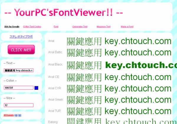 首頁免費字型字型工具 Font.colorfull 線上字型檢視器,一次列出所輸入的文字所有字型樣式 Windows 內建的字型檢視器,一次只能檢視一個字型樣式,對於美工人員應該不是太方便,若是能夠反過來將輸入的文字,使用所有字型列出字型樣式,應該較能符合需求。Font.colorfull 是一個免費的線上字型檢視器服務,他能夠將裝在電腦內的字型,根據你所輸入的文字,一次列出所有字型樣式,與之前所介紹的 FontViewOK 字型檢視工具,檢視所有字型﹝免安裝﹞具有相同的功能。 🔔 不錯過任何精彩! 立即訂閱我們的 LINE 官方帳號 每次發佈新文章時,您將會第一時間收到本站文章連結通知,輕鬆掌握最新資訊! 使用 LINE 追蹤文章更新 §相關文章,還可以參閱:FontShow 本機字型預覽與比較免費工具,線上輕鬆篩選最佳字體Font of Web 輸入網址就幫你找出該網站所使用的字體與下載網址如何建立自己手寫的英文字型?「守寫字」讓手寫字也能變成可用電腦打出的字體FontViewOK 字型比較免費工具 如何使用Font.colorfull? 1.進入 「Font.colorfull」網站後,點擊[CLICK ME!!]便會使用預設值列出所有字型樣式。 2.也可以自行輸入文字、選擇字型顏色及大小,設定好之後,點擊[CLICK ME!!]便會列出。 Font.colorfull網站網址:http://font.colorfull.jp/
