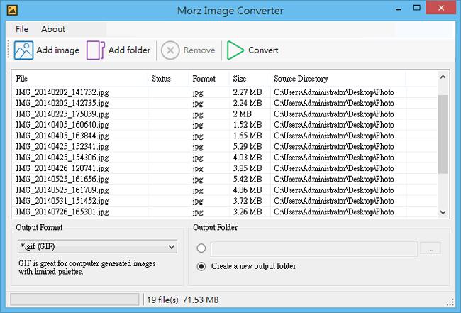 首頁電腦軟體檔案管理 Morz Image Converter 實用的圖檔格式轉換工具 Morz Image Converter 是一套可轉換圖檔格式的免費工具,支援 PNG, JPG, GIF, BMP 等主流圖檔格式單張轉換之外,也支援批次圖檔格式轉換,操作起來更方便。 🔔 不錯過任何精彩! 立即訂閱我們的 LINE 官方帳號 每次發佈新文章時,您將會第一時間收到本站文章連結通知,輕鬆掌握最新資訊! 使用 LINE 追蹤文章更新 §相關文章,還可以參閱:檔案好多重複怎麼辦?免費 dupeGuru 幫你一鍵清出電腦空間[ 免費使用 ]PDFgear 整合各種 PDF 工具,具格式轉換、編輯、合併或拆分等功能7-Zip 檔案壓縮與解壓縮免費軟體AmoK Exif Sorter 讓照片按拍照日期重新命名並自動分類的免費軟體PDF Unshare 限制 PDF 檔案的讀取有效日期 如何使用 Morz Image Converter? 完成安裝後,可點擊[ Add image ]來加入圖片,也可以點擊[ Add folder ]來加入整個資料夾內的圖片,接下來,選擇要輸出的圖檔格式,再按功能表[ Convert ],便會開始轉換。 Morz Image Converter版本:3.0.5664.25678語言:英文性質:免費適用:Windows官方網站:http://morzproject.com/morz-image-converter.html下載:按我下載