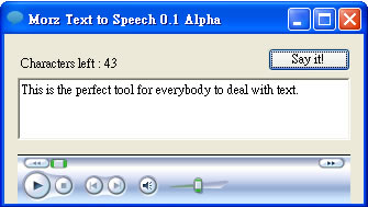 首頁電腦軟體翻譯辨識 Morz Text to Speech 使用 Google TTS 技術的文字轉語音工具(免安裝) Morz Text to Speech 是一套可以將輸入的英文直接轉成語音讀出的免費工具軟體,使用 Google TTS 技術來確保語音引擎始終保持在最新狀態,與先前所介紹的 Google Translate Desktop 實用的多語系翻譯工具含語音(免安裝 繁體中文版) 、Client for Google Translate 隨時隨地輕鬆使用Google翻譯 雖然功能較少了些,但是用來練習開口說英文還是不錯的,另外相類似的線上服務有 Text-to-Speech 線上文字轉語音服務,免費語言學習好地方(各國語言) 及 Putonghuaonline 線上文字轉語音,可練習廣東話,還提供文字轉拼音等服務!也是不錯的選擇! 🔔 不錯過任何精彩! 立即訂閱我們的 LINE 官方帳號 每次發佈新文章時,您將會第一時間收到本站文章連結通知,輕鬆掌握最新資訊! 使用 LINE 追蹤文章更新 §相關文章,還可以參閱:clawPDF 免費虛擬 PDF/Image 印表機,還有 OCR 功能DSpeech 中文也可用的文字轉語音免費軟體Balabolka 文字轉語音免費工具,可錄製成 WAV、MP3、OGG 或 WMA 聲音檔案微軟 Bing Microsoft Translator 協助你做出更好的語言翻譯Dictionary .NET 免費翻譯軟體下載(免安裝 繁體中文版) 如何使用 Morz Text to Speech? 1.下載後解壓縮,執行「texttospeech.exe」便可開啟 Morz Text to Speech 程式。 2.輸入想要讀出語音的文字後,點擊[Say it!]便可聽到語音讀出。 Morz Text to Speech版本:0.1語言:英文性質:免費適用:Windows官方網站:http://morzproject.com下載:按我下載 | 備用下載點