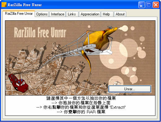 首頁電腦軟體檔案管理 RarZilla 免費的 RAR 解壓縮工具 免費的解壓縮軟體選擇有很多,7-ZIP 免費的壓縮及解壓縮軟體 、 PeaZip免費的壓縮及解壓縮軟體(免安裝繁體中文版) 、Zipeg 及 免費的線上解壓縮服務 WobZIP ,RarZilla 也是一套免費的解壓縮軟體,所支援的格式就是常見到的 RAR 壓縮檔。 🔔 不錯過任何精彩! 立即訂閱我們的 LINE 官方帳號 每次發佈新文章時,您將會第一時間收到本站文章連結通知,輕鬆掌握最新資訊! 使用 LINE 追蹤文章更新 §相關文章,還可以參閱:檔案好多重複怎麼辦?免費 dupeGuru 幫你一鍵清出電腦空間[ 免費使用 ]PDFgear 整合各種 PDF 工具,具格式轉換、編輯、合併或拆分等功能7-Zip 檔案壓縮與解壓縮免費軟體AmoK Exif Sorter 讓照片按拍照日期重新命名並自動分類的免費軟體PDF Unshare 限制 PDF 檔案的讀取有效日期 如何使用 RarZilla ? 1.下載並安裝,安裝時可選語言,在中間的步驟預設會安裝「Ask Toolbar」,可依需求決定是否安裝。 2.開啟 RarZilla 主介面後,會先出現操作說明視窗,點擊[OK]關閉該視窗。 3.將要解壓縮的 RAR 壓縮檔,拖拉放到介面的圖形上或點擊[Unrar...]來選擇 RAR 壓縮檔所在路徑。 4.接下來便會出現解壓縮的設定選項,若以後解壓縮不要再出現該視窗,可將下方的[Show this dialog again before next extraction]取消勾選,點擊[OK]。 5.若有密碼,則會出現輸入密碼框,輸入密碼後,點擊[OK]。 6.接下來便會開始解壓縮,解壓縮完成後會自動開啟接壓縮後的位置。 RarZilla版本:7.0語言:多國語言性質:免費適用:Windows官方網站:http://www.philipp-winterberg.de/software/rarzilla_free_unrar.php下載:按我下載 | 免安裝版(v2.55 0.6 MB)