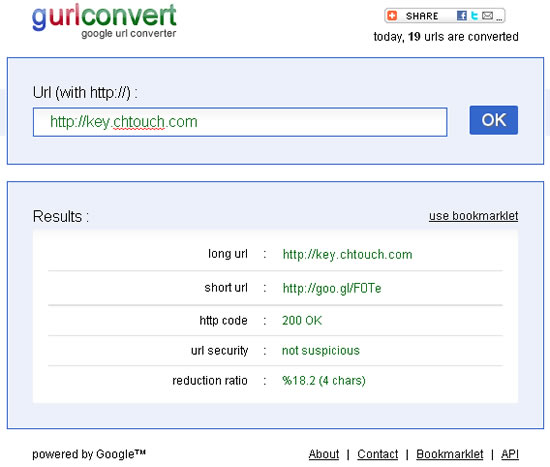 首頁線上工具網路應用 gurlconver 線上產生 Google 短網址的免費服務 有提供縮短網址服務有很多,像是「Tinyurl」、「Ptt.cc」、「Orz.tw」「Qto.tw」及「Zzb.bz」等,Google 也有短網址服務,gurlconver 該網站免費提供產生 goo.gl 短網址的服務,只要輸入原始網址便能產生出 goo.gl 網址。相關的線上免費服務,可參閱 gaigalas.net 線上產生 Google 短網址(Google URL Shortener)及網址的 QRCode 或是 「幫我縮網址」 可批次縮短網址的程式,Tinyurl、Ptt.cc、Orz.tw、Qto.tw及Zzb.bz﹝免安裝﹞! 也都相當不錯。 🔔 不錯過任何精彩! 立即訂閱我們的 LINE 官方帳號 每次發佈新文章時,您將會第一時間收到本站文章連結通知,輕鬆掌握最新資訊! 使用 LINE 追蹤文章更新 §相關文章,還可以參閱:Flying TTFB:免費網站測速工具!22個全球節點幫你找出網站慢在哪Google URL Shortener (goo.gl) 正式告別, 10個優質短網址替代方案推薦Zero Width Shortener (ZWS):隱形短網址的免費縮網址線上工具LibreSpeed SpeedtestCustom:免費網路速度測試工具,提供遠傳、台灣大哥大、中華、亞太等測試主機Web Check:全面分析網站運行狀況,提供全面資訊與指標 如何使用 gurlconver? 1.進入 gurlconver 網站後,輸入要轉換的網址 URL 後,點擊[OK],在隨後產生的 Results short url 處便可看到已產生的 goo.gl 網址。 2.另外該網站也有提供 API 供網頁設計師使用,點擊網頁右下的 API 即可進入調用說明。 gurlconver網站網址:http://gurlconvert.com/