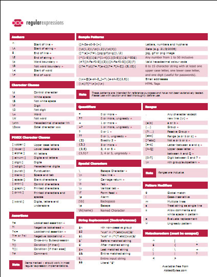 首頁電腦軟體開發工具 Regular Expressions 正則表達式參考指南 在製作網頁時,若要用到表單驗證或是檢查所輸入的字串格式,較簡便的方式就是用 Regular Expressions 正則表達式來進行驗證,例如驗證身分證號碼、EMail 格式、電話號碼、密碼格式或是字串內的英文大小寫、字數限制...等等,其驗證應用相較於傳統的字串拆分驗證不但速度快且程式碼精簡,在 addedbytes.com 的網站裡有提供一份「Regular Expressions 正則表達式參考指南」有用到的朋友可以參考看看。 🔔 不錯過任何精彩! 立即訂閱我們的 LINE 官方帳號 每次發佈新文章時,您將會第一時間收到本站文章連結通知,輕鬆掌握最新資訊! 使用 LINE 追蹤文章更新 §相關文章,還可以參閱:Virtual-C IDE 免費 C語言整合開發環境RocketCake 免費回應式網頁編輯器Cyotek Spriter 自動產出圖片型網頁的 CSS 及 HTML程式碼Pencil 圖形使用者介面(GUI)建立原型免費工具Easy CSS Menu 網頁多層次選單按鈕產生器 下載 Regular Expressions 下載 Regular Expressions(V2) Regular Expressions(648 KB) addedbytes.com語言:英文性質:免費官方網站:https://cheatography.com/davechild/cheat-sheets/regular-expressions/