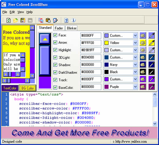 首頁電腦軟體開發工具 Free Colored ScrollBars 瀏覽器彩色滾動條(ScrollBar) CSS 及 JavaScript 特效產生器 想要加強網頁的呈現效果,當然除了要有好的內容、合適的色彩及版型配置外,也可以在瀏覽器的外觀上動些手腳,像是使用 Free StatusTitle Maker 免費的網頁瀏覽器標題欄或狀態欄訊息產生器 在瀏覽器的標題或狀態欄做一些與眾不統的特效或是使用 Free Colored ScrollBars 這套免費的瀏覽器彩色滾動條(ScrollBar) CSS 及 JavaScript 特效產生器,來加強瀏覽器的上下左右的滾動條的特效。 🔔 不錯過任何精彩! 立即訂閱我們的 LINE 官方帳號 每次發佈新文章時,您將會第一時間收到本站文章連結通知,輕鬆掌握最新資訊! 使用 LINE 追蹤文章更新 §相關文章,還可以參閱:Virtual-C IDE 免費 C語言整合開發環境RocketCake 免費回應式網頁編輯器Cyotek Spriter 自動產出圖片型網頁的 CSS 及 HTML程式碼Pencil 圖形使用者介面(GUI)建立原型免費工具Easy CSS Menu 網頁多層次選單按鈕產生器 如何使用 Free Colored ScrollBars? 1.下載解壓縮後進行安裝,安裝完成開啟主介面後,可以看到預設的範例,Free Colored ScrollBars 提供Standard、Fader 及 Blinker 三種效果。 2.選擇將使用的效果,例如 Fader 效果,其預設的參數設定均可更改,而每次更改便在右變欄中看到顯示的效果其下便產生相對應的 JavaScript Code。 3.調整好之後,複製所產生 JavaScript 程式碼,貼到網頁的<head></head>之間即可。 Free Colored ScrollBars版本:2.2語言:英文性質:免費適用:Windows官方網站:http://www.yaldex.com/ColoredScrollBars.htm下載:按我下載