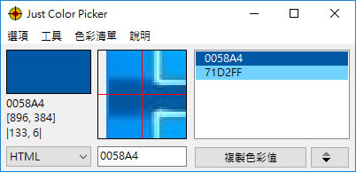 首頁電腦軟體生產力工具 Just Color Picker 精準的顏色選擇器(免安裝 繁體中文版) 不論是平面設計或是網頁美工,常有配色、抓取顏色及獲取顏色代碼的需要,而這個需求可以透過軟體工具來協助,除了先前所介紹 ColorPic 一套簡單好用的顏色選擇器! 或是網頁上的 0to255 線上簡單好用的顏色選擇及配色 都可以應用。Just Color Picker 是一套精準的顏色選擇器不需安裝即可直接執行,只要在電腦螢幕上任何一個位置,看到喜歡的顏色,滑鼠移到其上方,Just Color Picker 就會放大該目標且顯示出目標的顏色代碼,例如有些漸層色的圖片,放大後,可精準地取出顏色碼且可以使用 HTML、RGB、HEX、HSB/HSV 及 HSL 的顏色格式來標示出顏色代碼。 🔔 不錯過任何精彩! 立即訂閱我們的 LINE 官方帳號 每次發佈新文章時,您將會第一時間收到本站文章連結通知,輕鬆掌握最新資訊! 使用 LINE 追蹤文章更新 §相關文章,還可以參閱:AingDesk:一鍵安裝 Ollama AI 模型管理器,讓 LLaMA、DeepSeek 在本機電腦上運行Arc 瀏覽器正式登陸 Windows 11,開啟全新瀏覽體驗!Norton Secure Browser 使用 Chromium 核心的瀏覽器,有廣告封鎖和隱私保護功能BingGPT 桌面應用程式,讓你不用 Edge 也能用 Bing 聊天機器人SlippyClerk 數字、英文字母有序字串產生器 可自訂前後綴字詞 如何使用 Just Color Picker ? 1.下載後直接執行 「jcpicker.exe」便可開啟主程式,第一次開啟時會出現語言選項,可挑選合適的語言。 2.進入程式後,點擊[選項] >[顯示在最上層]設定將 Just Color Picker 顯示在最上層,方便後續取色操作。 3.將滑鼠移到螢幕上的任意喜歡顏色點,Just Color Picker 便會放大該點,以利選取最精準的顏色,確定後,使用[ ALT + X ] 定位該顏色代碼,定位後,會出現在顏色列表中,若要複製該顏色代碼,可點擊[複製色彩值]。 4.若覺得放大的還不夠,點擊[選項] >[縮放]來進行設定。 Just Color Picker版本:5.8語言:繁體中文(多國語言)性質:免費適用:Windows | Mac官方網站:https://annystudio.com/下載: Windows(64bit) 按我下載 Windows(32bit) 按我下載 Mac 按我下載