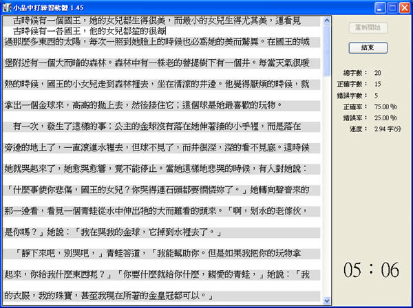 首頁教育學習打字練習 EssayCTyping 小品中文打字練習軟體,可自訂打字練習本 若想練習好中文打字,英打的基礎不能少,當然技巧與勤打也相當重要。免費的英文打字練習,在線上的可參閱 keybr.com 免費讓你練習英文打字的好所在!而桌面的應用程序可參考 Rapid Typing 英文打字練習(免安裝 繁體中文版) 。EssayCTyping 是一套小巧的中文打字練習軟體,可以自訂打字練習本,像是歌詞或是新聞之類,練習時會顯示目前成績及打字速度等。 🔔 不錯過任何精彩! 立即訂閱我們的 LINE 官方帳號 每次發佈新文章時,您將會第一時間收到本站文章連結通知,輕鬆掌握最新資訊! 使用 LINE 追蹤文章更新 §相關文章,還可以參閱:Live Typing Test:免費線上英文打字測試,提升速度與準確率typings:多語言線上免費打字練習工具,專為提升打字技能而設計Monkeytype 線上英打練習免費服務 快速提升打字速度與正確率TypingCat 提供英文打字課程、速度測試的免費網站「花蓮縣打字練習網」線上中、英文及注音符號打字練習 如何使用 EssayCTyping 小品中文打字練習軟體? 1.下載解壓縮後,執行「小品中打練習軟體1.45.exe」即可開啟,若要開始練習,須先自行製作一份打字練習本,打開記事本軟體,將所看到的新聞、文章或歌詞,複製後貼到新開的記事本,儲存成 TXT 文字檔即可,也可先下載官方給出的範本 青蛙王子。準備好之後,在已經開啟的小品中打練習軟體,點擊[讀取檔案],選擇剛剛下載或自己製作的文字檔,選擇好之後,點擊[開始]。 2.接下來在美行的下方空白處開始輸入且系統會自動開始計時,右邊欄會顯示即時的成績,在其下方會顯示已經使用的時間。 EssayCTyping版本:1.45語言:繁體中文性質:免費適用:Windows官方網站:http://sites.google.com/site/essayctyping/home/essayctyping-14下載:按我下載