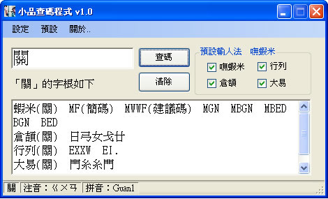 首頁教育學習打字練習 EssayWordsAnalysis 小品查碼程式,查詢嘸蝦米、倉頡、行列、大易的字根和拆碼方式(免安裝) 雖然 Windows 內建的注音輸入法很方便,且微軟也相當用心的不斷改善,像是新版的 Microsoft Office 輸入法 2010 不只考慮到新注音輸入法的使用者,也包含了新倉頡輸入法 2010、新速成輸入法 2010 與 香港粵語輸入法 2010 ,且支援 Windows XP 以上的作業系統。新注音輸入法門檻不高,相當好入門,但是倉頡或是嘸蝦米、行列及大易等的輸入法需要了解字根及拆碼規則,若是正在學習嘸蝦米、倉頡、行列、大易等輸入法,碰到不會拆碼的字,可以使用「EssayWordsAnalysis 小品查碼程式」這套免費的來協助,後續也不會覺得困難而放棄。 🔔 不錯過任何精彩! 立即訂閱我們的 LINE 官方帳號 每次發佈新文章時,您將會第一時間收到本站文章連結通知,輕鬆掌握最新資訊! 使用 LINE 追蹤文章更新 §相關文章,還可以參閱:Live Typing Test:免費線上英文打字測試,提升速度與準確率typings:多語言線上免費打字練習工具,專為提升打字技能而設計Monkeytype 線上英打練習免費服務 快速提升打字速度與正確率TypingCat 提供英文打字課程、速度測試的免費網站「花蓮縣打字練習網」線上中、英文及注音符號打字練習 如何使用EssayWordsAnalysis 小品查碼程式? 1.下載 EssayWordsAnalysis 小品查碼程式後,解壓縮後,執行解壓縮後的執行檔(.exe 若解壓縮後的執行檔,檔名是亂碼,可自行命名),開啟後,輸入要查詢的中文字,點擊[查碼]即會列出嘸蝦米、倉頡、行列、大易等輸入法的字根組合,畫面的最下方還列出注音符號及漢語拼音。 2.EssayWordsAnalysis 小品查碼程式,也支援字根的反向查詢,輸入字根組合,點擊[查碼]便會列出該字。 EssayWordsAnalysis 小品查碼程式版本:1.0語言:繁體中文性質:免費適用:Windows官方網站:http://sites.google.com/site/essayctyping/home/essaywordsanalysis-v10下載:按我下載