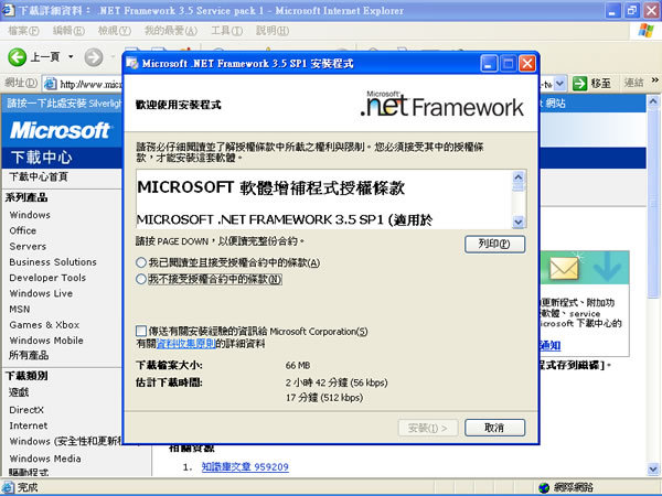 首頁電腦軟體系統應用 如何安裝 Microsoft .NET Framework? 越來越多的程式在安裝時都要求要安裝.NET Framework,才能進行後續的安裝,那究竟什麼是Microsoft .NET Framework?首先說明它是免費的且是由微軟開發,一個致力於敏捷軟體開發(Agile software development)、快速應用開發(Rapid application development)、平臺無關性和網路透明化的軟體開發平臺。.NET是微軟為下一個十年對伺服器和桌上型軟體工程邁出的第一步。NET 包含許多有助於互聯網和內部網應用迅捷開發的技術。.NET框架是微軟公司繼 Windows DNA 之後的新開發平臺。.NET框架是以一種採用系統虛擬機運行的編程平臺,以通用語言運行時(Common Language Runtime)為基礎,支援多種語言(C#、VB.NET、C++、Python等)的開發。.NET 也為應用程序介面(API)提供了新功能和開發工具。這些革新使得程式設計員可以同時進行Windows應用軟體和網路應用軟體以及元件和服務(web服務)的開發。.NET 提供了一個新的反射性的且物件導向程式設計編程介面。.NET 設計得足夠通用化從而使許多不同高階語言都得以被彙集。 🔔 不錯過任何精彩! 立即訂閱我們的 LINE 官方帳號 每次發佈新文章時,您將會第一時間收到本站文章連結通知,輕鬆掌握最新資訊! 使用 LINE 追蹤文章更新 §相關文章,還可以參閱:CatLock:可鎖定鍵盤的 Windows 應用程式,防止寵物意外觸碰Zen Ad blocker 瀏覽器與應用程式均適用的廣告攔截器,免費且開放原始碼TimVer 一站式顯示 Windows 版本及電腦硬體相關訊息的工具「微軟電腦管家」內含開機啟動項目管理、儲存空間最佳化等免費工具 全方位提升電腦效能Windows Startup Timer 測量 Windows 從開機到完全啟動所需時間 如何安裝 Microsoft .NET Framework? 1.到微軟官網下載.NET Framework,目前版本為.NET Framework 3.5 Service Pack 1及.NET Framework 4 Beta 2 版也已開放下載,當你執行安裝程式後,首先是授權協議,選擇[我已閱讀並且接受授權合約中的條款]後,按[安裝] 2.接著安裝程式就會去下載後面的主程式並且安裝到你的電腦 3.安裝完成 說的簡單一點 Microsoft.NET Framework 不是軟體,是.NET程式運行需要的一組支援函式庫,意思就是如果用 Microsoft Visual Studio 開發軟體所開發出來的程式,你想在你的電腦上使用它,就需要安裝 Microsoft.NET Framework。 Microsoft .NET Framework官方網站:http://msdn.microsoft.com/en-us/netframework/aa569263.aspx下載: Microsoft .NET Framework 3.5 Service pack 1 (Full Package) - 繁體中文 Microsoft .NET Framework 4 (獨立安裝程式)