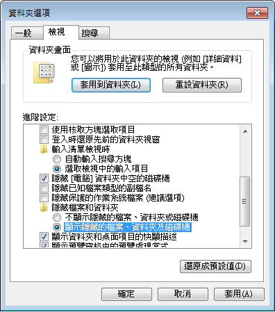首頁操作技巧Windows [ Windows ]如何顯示檔案的副檔名及被隱藏保護的檔案? 在 Windows 系列裡,預設都是不顯示受保護的作業系統檔案及檔案的副檔名,檔案的類型是以圖示的方式來顯示,若想要精確地得知檔案的附檔名,提供 2 種方法參考,其一,可在該檔案上,點擊滑鼠右鍵後,再點擊[內容]來顯示檔案的詳細資訊,不過不方便且無法顯示隱藏檔。其二,可透過資料夾的設定來顯示隱藏檔及檔案的副檔名。 🔔 不錯過任何精彩! 立即訂閱我們的 LINE 官方帳號 每次發佈新文章時,您將會第一時間收到本站文章連結通知,輕鬆掌握最新資訊! 使用 LINE 追蹤文章更新 §相關文章,還可以參閱:你的 Windows 筆電是真睡還是裝睡?一個設定終結背包發熱耗電學起來!微軟親授 10 個提升 Windows PC 效能的技巧如何升級 Windows 11 25H2?最新版本功能亮點與完整更新步驟Windows 工作列時鐘顯示秒數:真的會影響電池續航力嗎?LTT Labs 完整實測解析Windows 快速取出資料夾檔案名稱清單!內建功能輕鬆搞定,不用額外軟體 [ Windows ]如何顯示檔案的副檔名及被隱藏保護的檔案? 1.點擊[組合管理] >[資料夾與搜尋選項]。 2.在開啟的設定視窗中,切換到[檢視]頁籤。 3.若要顯示檔案的副檔名,可取消勾選[隱藏已知檔案類型的副檔名],若要顯示隱藏保護的作業系統檔案,可取消勾選[隱藏保護的作業系統檔案](會先出現警告視窗),再點選旗下列管的[顯示隱藏的檔案、資料夾及磁碟機] 4.設定好的樣板,設定好之後,點擊[確定],離開設定視窗。 5.接下來就可以看到檔案的副檔名及預設不顯示隱藏保護的作業系統檔案。