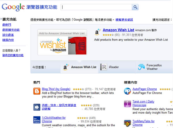 首頁瀏覽器擴充功能網頁瀏覽 「Google 瀏覽器擴充功能」 為 Google Chrome 瀏覽器增添更多更方便的功能 在作業系統上安裝 Google Chrome 瀏覽器 應該是很多人的選擇,除了速度快,且所支援的 Google 瀏覽器擴充功能也相當多,像是 Chromepad 記事本、YouTube HD Suite 下載 YouTube 影片好幫手或是Webpage Screenshot 製作網頁全頁或可視範圍內的 PNG 圖檔都獲得不錯的評價,其實Google 瀏覽器的外掛相當多,可以去 Google 其中的網站服務 - 「Google 瀏覽器擴充功能」來將 Google Chrome 瀏覽器裝備的更方便使用。 🔔 不錯過任何精彩! 立即訂閱我們的 LINE 官方帳號 每次發佈新文章時,您將會第一時間收到本站文章連結通知,輕鬆掌握最新資訊! 使用 LINE 追蹤文章更新 §相關文章,還可以參閱:Font Finder & Style Detector 網頁字型搜尋與樣式偵測器,免費瀏覽器擴充功能MarkX 將網頁所選文字內容儲存成書籤,提供關鍵字搜尋功能U-Eyes 移動設備瀏覽網站模擬器,可擷取網頁成圖片與錄製螢幕Live CSS Tester 在任何網頁注入 CSS 進行即時測試Quick History 以網站角度快速檢視該網站的瀏覽紀錄(瀏覽器擴充功能) 進入 「Google 瀏覽器擴充功能」 網站後,透過網頁上方的搜尋框,可輸入想要的擴充功能關鍵字進行搜尋或點擊左側的[最熱門]來看看大家的裝些什麼擴充功能。 如何安裝Google 瀏覽器擴充功能? 1.找到自己合適的擴充功能後,例如要安裝 虛擬鍵盤 ,使自己不論瀏覽哪一個網頁,隨時都可以利用虛擬鍵盤在輸入欄位中鍵入各國語言文字,點擊[虛擬鍵盤]便會到達安裝網頁。 2.點擊[安裝],便會開始下載,安裝前會出現一個詢問視窗,點擊[安裝]。 3.安裝完成後,在瀏覽器的右上方,就會出現已安裝完成的通知框,接下來便可使用。 如何管理及設定 Google 瀏覽器擴充功能? 1.點擊右上方的設定按鈕,並在出現的功能表中點擊[擴充功能]。 2.接下來就會出現已安裝的擴充功能頁面,可[停用]、[解除安裝],若所安裝的擴充功能有選項設定,便會出現[選項],點擊[選項]。 3.接下來就可以設定剛剛所安裝的擴充功能。 「Google 瀏覽器擴充功能」性質:免費官方網站:https://chrome.google.com/extensions/?hl=zh-tw