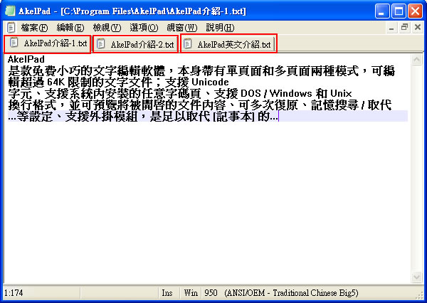 首頁電腦軟體文書編輯 AkelPad 取代 Windows 系統內建記事本的軟體(中文版) Windows系統中的記事本功能太陽春,常常要開啟一些容量大一點的檔案時就得等個半天,因此有許多使用者都希望能夠找一款功能尚可及開檔快速的軟體來取代系統內建的記事本, 當然重點是還要免費,如果你是,相信AkelPad 就是個不錯的選擇。 AkelPad 是款免費小巧的文字編輯軟體,本身帶有單頁面和多頁面兩種模式,可編輯超過 64K 限制的文字文件;支援 Unicode 字元、支援系統內安裝的任意字碼頁、支援 DOS / Windows 和 Unix 換行格式,並可預覽將被開啟的文件內容、可多次復原、記憶搜尋 / 取代 ...等設定、支援外掛模組,是個足以取代 [記事本] 的優秀工具。 🔔 不錯過任何精彩! 立即訂閱我們的 LINE 官方帳號 每次發佈新文章時,您將會第一時間收到本站文章連結通知,輕鬆掌握最新資訊! 使用 LINE 追蹤文章更新 §相關文章,還可以參閱:PDF Arranger 可調整順序、刪除、旋轉...的多功能 PDF 工具程式Text Replacer 文字替換免費工具如何在 PDF 文件裡添加額外的文字、圖片、圖形或繪圖?Notepad++ 免費多功能記事本軟體doPDF 可在任何程式中藉由[ 列印 ]功能來建立 PDF 檔案 AkelPad除了包含記事本的功能及效能改進外,最大的特色應該是在其分頁模式 1.啟用分頁[選項] > [視窗模式] > [多重視窗],接著會要求你重新執行AkelPad,再開啟後便會是多重視窗模式 2.如下圖 AkelPad版本:4.9.7語言:中文(多國語言)性質:免費適用:Windows官方網站:http://akelpad.sourceforge.net/en/index.php下載:按我前往官方下載頁面