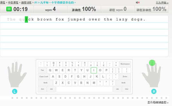 5.在練習單元的左右兩側各有一隻手,會使用綠色圈圈標示來提示該用哪根手指頭來打該字母。