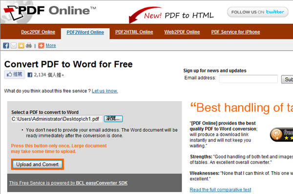 首頁線上工具檔案管理 PDF Online 線上 PDF 轉檔服務,可支援中文的 DOC 轉 PDF、PDF 轉 Word、PDF 轉 HTML 及 Web 轉 PDF PDF Online 是一個以 PDF 檔案格式為中心的轉檔服務,可支援 DOC 轉 PDF、PDF 轉 Word、PDF 轉 HTML 及 Web 轉 PDF,且支援中文。相類似的線上服務也可以試試 Convert PDF Document to Word 或 功能相當豐富的fileminx.com 可支援文件、圖片、音樂及影片格式的線上轉檔服務 。 🔔 不錯過任何精彩! 立即訂閱我們的 LINE 官方帳號 每次發佈新文章時,您將會第一時間收到本站文章連結通知,輕鬆掌握最新資訊! 使用 LINE 追蹤文章更新 §相關文章,還可以參閱:VERT:開源本地端檔案格式轉換器,隱私優先的免費瀏覽器轉檔工具PageSplitty 線上 PDF 分割轉 JPG、PNG、WebP 圖工具,支援 5GB 大小的大檔案PixDuplicate:免上傳快速找出並刪除重複照片的免費線上工具Adapter:全方位影片、音檔及圖片格式轉換免費軟體,支援影片轉音檔與圖片,音檔及圖片格式互轉TextCompare 線上比較 Excel、PDF 及圖片,快速找出檔案不同之處 如何使用PDF Online? 1.進入 PDF Online 網站後,其提供 DOC2PDF Online、PDF2Word Online、PDF2HTML Online 及 Web2PDF Online 等線上服務,另有 PDF Service for iPhone 及 PDF API。以 PDF2Word Online 為例,切換到 PDF2Word Online 頁籤,並點擊[瀏覽]將要轉檔的 PDF 檔案,選取進來後,點擊[Upload and Convert]。 2.接下來就會開始上傳檔案及轉檔,點擊[Right-Click here]下載或開啟該檔案。 3.轉檔後的文件是以 rtf 為副檔名,使用 Word 開啟後。 若轉換的 PDF 文件內容接近一般的文件檔,轉出來的檔案格式會接近原本的 PDF 檔案格式;若 PDF文件中有大量的圖片、表格、文字方塊,可能轉出來的位置會亂掉。 PDF Online網站網址:http://www.pdfonline.com/pdf-to-word-converter/