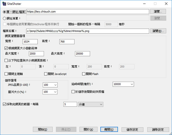 首頁電腦軟體生產力工具 SiteShoter 可定時將網頁擷取成圖片的工具(免安裝 繁體中文版) 如果想將網頁擷取成圖片,可以使用鍵盤的[ Print Screen ]按鍵來達成,但只能做到網頁可視範圍的擷取,想自訂尺寸或全網頁擷取,還是需要透過像是 URL2JPEG 工具或是 如何使用 Google Chrome 內建功能完整的擷取網頁成圖片? 來協助達成。SiteShoter 也是一套網頁擷取成圖片工具,可全頁或自訂擷圖尺寸,也可以關閉卷軸、JavaScript 或 Flash 讓圖面更簡潔,且提供繁體中文介面,操作更方便,SiteShoter 除了提供擷取網頁成圖片的功能之外,也提供多網址及定時的功能,讓網頁截圖也能很自動化。 🔔 不錯過任何精彩! 立即訂閱我們的 LINE 官方帳號 每次發佈新文章時,您將會第一時間收到本站文章連結通知,輕鬆掌握最新資訊! 使用 LINE 追蹤文章更新 §相關文章,還可以參閱:AingDesk:一鍵安裝 Ollama AI 模型管理器,讓 LLaMA、DeepSeek 在本機電腦上運行Arc 瀏覽器正式登陸 Windows 11,開啟全新瀏覽體驗!Norton Secure Browser 使用 Chromium 核心的瀏覽器,有廣告封鎖和隱私保護功能BingGPT 桌面應用程式,讓你不用 Edge 也能用 Bing 聊天機器人SlippyClerk 數字、英文字母有序字串產生器 可自訂前後綴字詞 如何使用 SiteShoter? 1.中文化步驟,下載軟體及繁體中文語系檔後,將其解壓縮在同一資料夾內,執行「 SiteShoter.exe 」開啟後便是繁體中文介面。 2.例如要擷取本網站的首頁,可在單一URL處,輸入要擷取網頁的 URL 網址,並在檔案名稱處,給予檔案名稱及存放路徑,檔案格式可選擇 PNG、JPG、TIFF、BMP 及 GIF,若要將此次的設定,定為後續要抓取網頁截圖的標準,可點擊[儲存設定],日後要擷取網頁圖片時,可使用[讀取設定]載入設定值即可。設定好之後點擊[開始]。 3.若想定時擷取網頁,可勾選[每次均採取網頁截圖]選項,來設定幾秒、分鐘或小時,擷取一次,為避免相同檔名,所造成覆蓋之前檔案,可使用參數: c:\temp\%date:MMddyyyy%\g%time:HHmmss%.jpg 以年月日當作資料夾名稱及時間當作檔案名稱 c:\temp\mysite%time:HHmm%.jpg 以 mysite 開頭 + 時間當作檔案名稱 c:\temp\site%date:MMyyyy%\nirsoft.png 以 site + 年月日為資料夾名稱 如下圖為設定每 25 秒,進行擷取網頁成為圖片一次,並放在關鍵應用資料夾,檔案名稱為時+分+秒.jpg 4.全網頁擷取後的圖片。 SiteShoter版本:1.42語言:繁體中文(多國語言)性質:免費適用:Windows官方網站:https://www.nirsoft.net/utils/web_site_screenshot.html下載:按我下載 繁體中文語系檔:按我下載