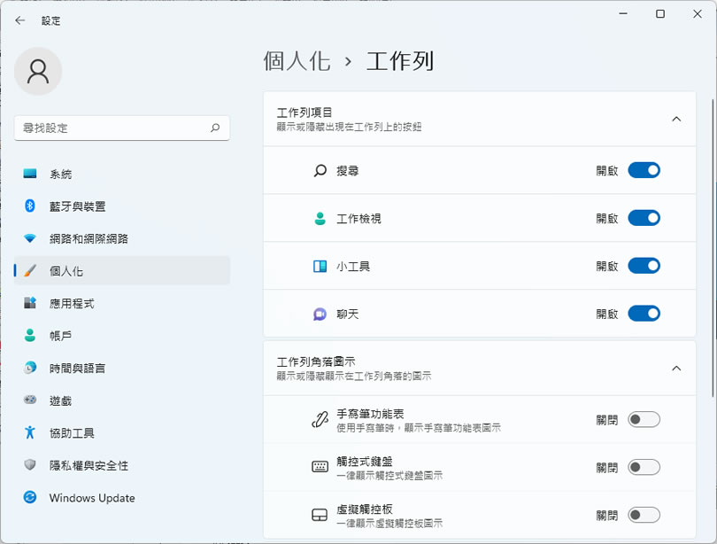 首頁操作技巧Windows [ Windows 11 ]如何隱藏或顯示工作列上的聊天、小工具或工作檢視按鈕? Windows 11 作業系統在完成安裝後,預設出現在工作列上的按鈕有些可以用移除的方式,有些則不可以,例如聊天、小工具、工作檢視或是搜尋按鈕這些都無法將之移除,如果用不到又一直出現在工作列上,其實對使用者而言是個很大的困擾,既然移除不掉,我們可以透過設定 > 個人化功能,進入工作列的設定介面,將前述的這些按鈕隱藏,讓工作列只保留自己常用的按鈕,日後,如果要用到,還是可以將其顯示回工作列上。 🔔 不錯過任何精彩! 立即訂閱我們的 LINE 官方帳號 每次發佈新文章時,您將會第一時間收到本站文章連結通知,輕鬆掌握最新資訊! 使用 LINE 追蹤文章更新 §相關文章,還可以參閱:你的 Windows 筆電是真睡還是裝睡?一個設定終結背包發熱耗電學起來!微軟親授 10 個提升 Windows PC 效能的技巧如何升級 Windows 11 25H2?最新版本功能亮點與完整更新步驟Windows 工作列時鐘顯示秒數:真的會影響電池續航力嗎?LTT Labs 完整實測解析Windows 快速取出資料夾檔案名稱清單!內建功能輕鬆搞定,不用額外軟體 [ Windows 11 ]如何隱藏或顯示工作列上的聊天、小工具或工作檢視按鈕? 1.Windows 11預設在工作列上的聊天、小工具、搜尋及工作檢視按鈕,如果使用滑鼠右鍵點擊是不會出現快速功能表。 2.開啟[ 設定 ]視窗,進入到個人化 > 工作列的選項,可以看到前述的四個按鈕預設都是開啟的。 3.更改設定後,前述的四個按鈕就會隱藏,工作列也變得較清爽,日後,若想這些按鈕回到工作列上,只要重新設定開啟即可。