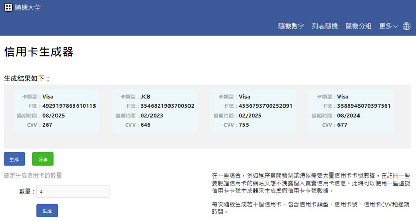 首頁線上工具生活資訊 「信用卡生成器」 MasterCard、JCB 及 Visa 信用卡卡號產生器 透過應用程式儲存到資料庫的資料,通常會在應用程式端就先行檢查輸入資料的正確性,避免後續應用時的麻煩,因此,程式上線初期為驗證程式對某項輸入資料的完整性及正確性,就必須有測試資料,以信用卡號碼來說,要取得這些測試資料,也不必自寫程式產生,網上就有很多像是 Credit Card Generator 此類的產生器,而且產生的卡號也都經過可用驗證。 「信用卡生成器」同樣可用來產生信用卡卡號及卡號到期日及其 CVV 三碼檢查碼的網上應用,每次最多可隨機產生 20個可供驗證的 MasterCard、JCB 及 Visa 信用卡卡號,讓使用者拿來測試。 🔔 不錯過任何精彩! 立即訂閱我們的 LINE 官方帳號 每次發佈新文章時,您將會第一時間收到本站文章連結通知,輕鬆掌握最新資訊! 使用 LINE 追蹤文章更新 §相關文章,還可以參閱:Apple Music 台灣新用戶優惠:6個月免費暢聽,領取方式與限制一次看!2026春節追劇清單!Netflix 2月必看攻略:燒腦推理、火爆動作片,陪你從初一爽追到開工!459 萬人搶 60 萬份!運動幣中獎號碼公布,快查你的身分證尾數都馬一起GO!LINE GO新年優惠最高拿$800優惠券,還有一個月乘車金等你抽過年搭高鐵自由座要排多久?看LINE就知道 台灣高鐵×LINE TODAY推出春節限定燈號預估服務 如何使用 「信用卡生成器」產生信用卡卡號相關資料? 1.使用瀏覽器開啟 「信用卡生成器」,預設就會產生四組,包含 MasterCard、JCB 及 Visa 信用卡卡號。 2.如果覺得四組太少,可以在數量處調整要產生的數字,再按[ 生成 ]按鈕即可。 3.產生的信用卡號到底能不能用,我們可以透過 信用卡卡號檢查器來協助。 「信用卡生成器」網站網址:https://www.suijidaquan.com/zh-tw/credit-card-generator相關網址:信用卡卡號檢查器