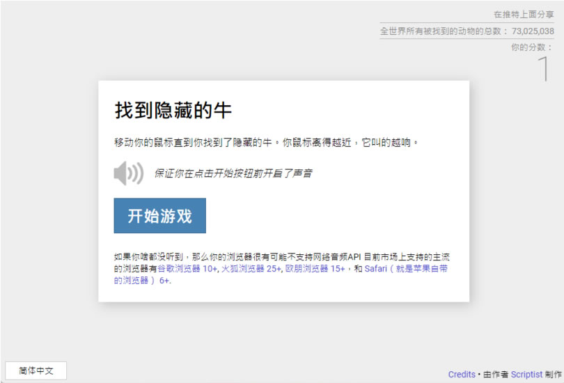 首頁線上工具益智遊戲 Find the Invisible Cow 用聲音找到網頁中隱藏的牛 坦白說這個遊戲很無厘頭,網頁就是一片空白,頁面中有隻隱藏的牛,玩家需要移動滑鼠游標將那隻牛找出來,而唯一的指示就是游標越靠近那隻牛叫聲就會越大,真找到那隻牛,游標就會變成手式,點擊下去牛就出來了,螢幕越大越難找,如果用手機瀏覽器或是將瀏覽器視窗縮小都會加快找到那隻牛的速度。 🔔 不錯過任何精彩! 立即訂閱我們的 LINE 官方帳號 每次發佈新文章時,您將會第一時間收到本站文章連結通知,輕鬆掌握最新資訊! 使用 LINE 追蹤文章更新 §相關文章,還可以參閱:Google Doodle 萬聖節遊戲登場!小精靈 45 週年特別版完整介紹毫秒級反應力大挑戰!用 Reaxon 訓練大腦、眼睛與手的協調反應2048 Cupcakes 經典單人 2048 滑塊線上遊戲,AI 輔助輕鬆挑戰高分免費線上拼圖遊戲平台:iLoveJigsaw 可自行上傳圖片製作拼圖Songlio:線上聽音樂猜歌曲名稱遊戲,可自訂歌曲題庫並與多人一起挑戰 如何在 Find the Invisible Cow 找到牛? 1.使用瀏覽器進入 Find the Invisible Cow 網站,玩家就會看到遊戲規則,原則上就是滑鼠游標越靠近那隻牛,叫的聲音就越大聲。 2.遊戲就是在這一大片空白區域找牛,指示就是聲音。 3.當滑鼠游標只到那隻牛時,滑鼠游標就是變成手式,點擊下去牛就出現了。 Find the Invisible Cow網站網址:https://findtheinvisiblecow.com/