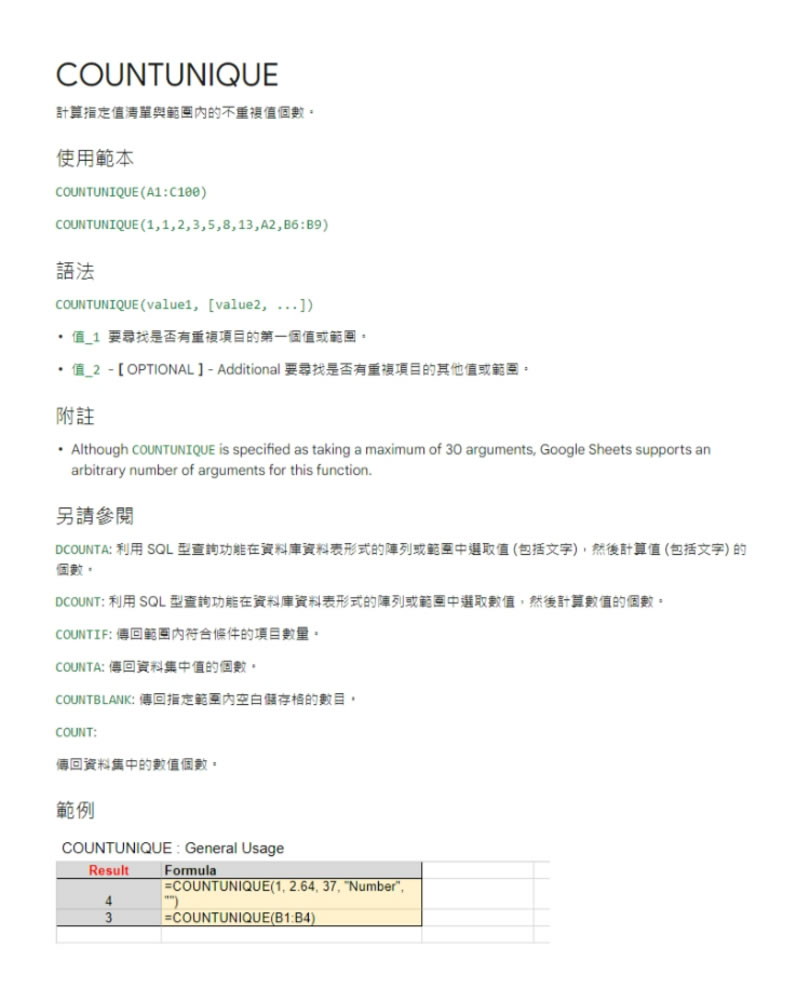 1.先來看看 Google 官方對 COUNTUNIQUE 函數 及 COUNTUNIQUEIFS 函數 的用法說明。
