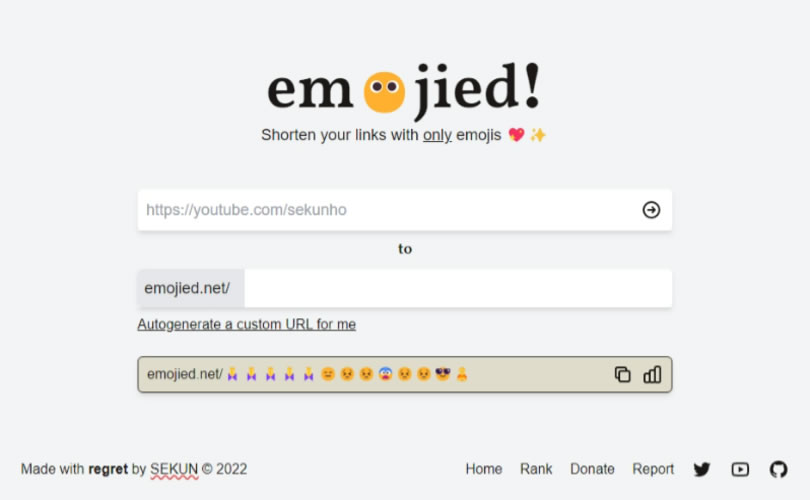 首頁線上工具網路應用 Emojied 線上產生融入表情符號的短網址 一般的縮網址服務,其操作方式通常就是輸入原網址後,會幫你產生一個看起來跟原網址無關,但網址又會很短的網址,像是TinyURL、is.gd產生的網址也與一般網址看起來無異,而 Emojied 同樣是個提供縮短網址的免費服務網站,其特別之處,就是將表情符號融入到網址中,讓網址看來不再只有文字,也能有表情符號的加入。 🔔 不錯過任何精彩! 立即訂閱我們的 LINE 官方帳號 每次發佈新文章時,您將會第一時間收到本站文章連結通知,輕鬆掌握最新資訊! 使用 LINE 追蹤文章更新 §相關文章,還可以參閱:Flying TTFB:免費網站測速工具!22個全球節點幫你找出網站慢在哪Google URL Shortener (goo.gl) 正式告別, 10個優質短網址替代方案推薦Zero Width Shortener (ZWS):隱形短網址的免費縮網址線上工具LibreSpeed SpeedtestCustom:免費網路速度測試工具,提供遠傳、台灣大哥大、中華、亞太等測試主機Web Check:全面分析網站運行狀況,提供全面資訊與指標 如何使用 Emojied 產生有表情符號的短網址? 1.Emojied 可以產生如下圖的短網址,而這個短網址會由表情符號來組成。 2.使用瀏覽器進入 Emojied 網站,輸入要縮短的原來網址後,按輸入框中最右側的圓形帶向右箭頭的圖示按鈕,就能產生一組帶有表情符號的短網址。 3.表情符號採隨機生成,如要自訂,可以按 Custom URL 輸入,最後同樣按輸入框中的最右側的圓形帶有向右箭頭的圖示按鈕來產生短網址。 4.Emojied 提供簡單的點擊次數數據,可線上查詢,亦可以 Report this URL as malicious 選擇電子郵件信箱來接收數據報告。 Emojied網站網址:https://emojied.net/