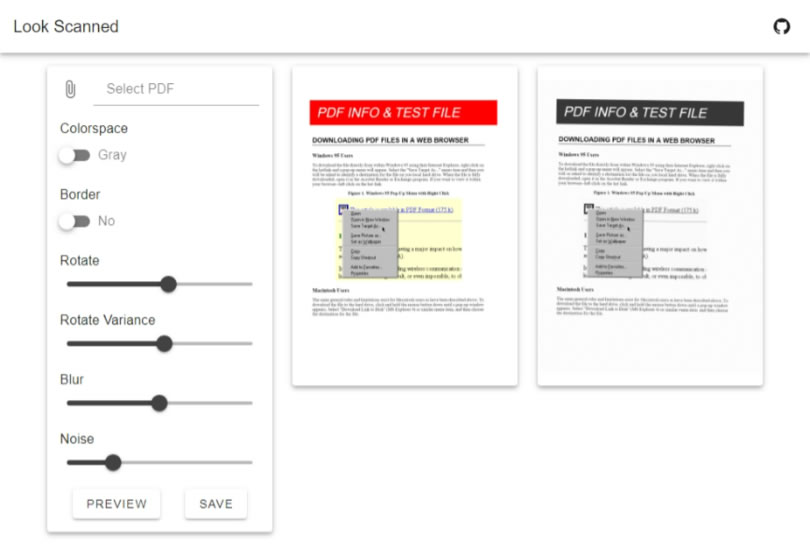 首頁線上工具生產力工具 Look Scanned 讓非掃描產生的 PDF 文件也能有手工掃描的模樣 需要將紙本文件掃描成 PDF 檔案,若沒有掃描器,最簡單的方法就是在行動裝置上使用 Google 雲端硬碟應用程式和裝置上的相機,就能輕鬆掃描內容,而掃描出的文件會以 PDF 檔案格式儲存在雲端硬碟中,但如果想將現成已數位化的 PDF 檔案,製作成像似透過手工掃描而成的 PDF檔案呢?可能很多人會想到的方法就是列印出來,然後開啟行動裝置來掃描,方法雖可,但做起來不輕鬆,如果有這樣的需求,可以將 PDF 檔案上傳到 Look Scanned 這個免費網站來製作,過程中,使用者可以自訂顏色、旋轉角度、模糊程度及加入 Noise,讓整份文件看起來就是手動掃描而成的 PDF 檔案。 🔔 不錯過任何精彩! 立即訂閱我們的 LINE 官方帳號 每次發佈新文章時,您將會第一時間收到本站文章連結通知,輕鬆掌握最新資訊! 使用 LINE 追蹤文章更新 §相關文章,還可以參閱:Google AI Plus 降到 260 元對決 ChatGPT Go!誰的功能更值得訂閱?ChatGPT Go 月付 290 元值得嗎?免費版、Plus 完整比較用 AI 做出的電影,YouTube 就看得到!一起來欣賞這部贏得百萬美元的突尼西亞短片《Lily》Apple Creator Studio 來了:Final Cut Pro、Logic Pro 等九款 App 月付 390 元,學生優惠僅 90 元ChatGPT 智慧購物功能登台!台灣用戶也能用 AI 做商品研究與比價 如何使用 Look Scanned 線上工具將 PDF 檔案內容手工化? 1.使用瀏覽器開啟 Look Scanned 網站,按 START SCANNING 按鈕進入製作頁面。 2.進入製作頁面,預設會有分 PDF文件供使用者操作練習,我們可以透過左側參數面板進行調整,按 PREVIEW 進行預覽。 3.實際操作時,我們可以按左側面板最上方的 Select PDF 來選擇 PDF 檔案,並在完成後,按 SAVE 來下載。 Look Scanned網站網址:https://lookscanned.io/