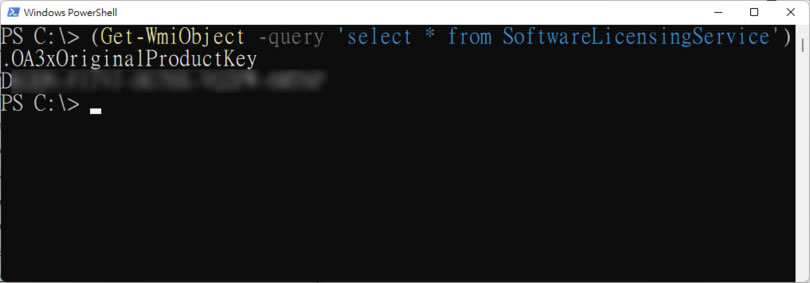 首頁操作技巧Windows 如何使用 PowerShell 查詢 Windows 產品金鑰? Windows 產品金鑰是電腦安裝 Windows 後用來啟用 Windows 的重要依據,該金鑰有 25 個字元代碼。 看起來會像這樣: XXXXX-XXXXX-XXXXX-XXXXX-XXXXX,要查詢目前 Windows 所使用的產品金鑰,在不安裝任何協助軟體的情況下,我們可以利用 Windows 內建的 命令提示字元 或是利用 PowerShell 透過指令的方式查詢 Windows 產品金鑰,當然,如果不想下指令查詢,也可以透過 PK Finder 或是 SterJo Windows Key Finder 等在內的第三方應用程式來協助。 🔔 不錯過任何精彩! 立即訂閱我們的 LINE 官方帳號 每次發佈新文章時,您將會第一時間收到本站文章連結通知,輕鬆掌握最新資訊! 使用 LINE 追蹤文章更新 §相關文章,還可以參閱:學起來!微軟親授 10 個提升 Windows PC 效能的技巧如何升級 Windows 11 25H2?最新版本功能亮點與完整更新步驟Windows 工作列時鐘顯示秒數:真的會影響電池續航力嗎?LTT Labs 完整實測解析Windows 快速取出資料夾檔案名稱清單!內建功能輕鬆搞定,不用額外軟體Windows 11 如何縮小工作列圖示按鈕,打造更精簡桌面視覺 如何使用 PowerShell 查詢 Windows 產品金鑰? 1.透過工作列上的搜尋工具,找到 PowerShell 應用程式並開啟。 2.複製以下指令,貼到 PowerShell 視窗中。 (Get-WmiObject -query 'select * from SoftwareLicensingService').OA3xOriginalProductKey 3.按下鍵盤 Enter 鍵後,就可以看到目前 Windows 的產品金鑰。