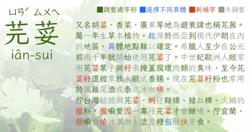 首頁免費字型中文字型 「芫荽」硬筆楷書中文繁體字型 免費下載使用 原內建在 macOS 作業系統的 Klee(クレー)字型,因其具有楷體筆調、又有仿宋的整齊端正,頗受中文使用者喜好,但畢竟是日文字型,對中文時仍有一定程度缺字,然在 Fontworks 忽然以開源授權釋出了 Klee One 字型後,由「字嗨」發起人「But Ko」 便以 Klee One 字型為基礎,打造出「芫荽」字體,不僅比常見的標楷體更為優雅大方,在補字超過 1500字後,面向公眾開放下載,其使用上並無任何限制,藉此增加字體實用性。 🔔 不錯過任何精彩! 立即訂閱我們的 LINE 官方帳號 每次發佈新文章時,您將會第一時間收到本站文章連結通知,輕鬆掌握最新資訊! 使用 LINE 追蹤文章更新 §相關文章,還可以參閱:字言字型免費中文字體1—手繪體:融合宋楷雙韻的手繪塗鴉字型,免費可商用結合傳統與現代美學的台灣日曆字型「日曆體」免費開源下載荊南麥圓體 KN Maiyuan:可愛圓潤的免費商用中文字體LINE Seed TW:圓潤親切的繁體中文字體,不但免費還可商用香萃刻宋:免費可商用的仿古雕刻宋體字型,展現濃厚人文與視覺張力 如何安裝與使用「芫荽」硬筆楷書字型 ? 1.解壓縮所下載的檔案後,可用滑鼠右鍵按 .ttf字型檔案先預覽再安裝或按[ 顯示其他選項 ]直接選擇安裝。 2.實際應用時,將字體選擇「芫荽 0.94」即可。 「芫荽」硬筆楷書字型性質:免費官方網站:https://github.com/ButTaiwan/iansui下載:※下載前,請先到官網確認有無釋出新版,以下下載連結為 v0.943 按我下載