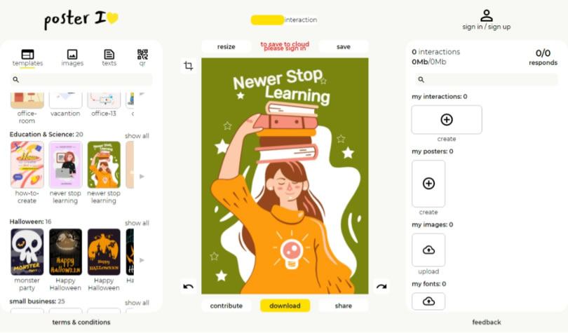 首頁線上工具影像繪圖 Poster I Love 提供海報設計模板及各類素材的線上海報產生器 Poster I Love 是一個海報製作網站,其提供像是運動、學校、二維碼海報、周末、節日、人物、流行、家庭、辦公室...等各種主題模板,並可快速加入文字、圖片及 QR Code 等相關素材,讓使用者只要經過簡單的調整與修改就可以製作出具水準以上的海報,且完成製作的海報無須註冊就可以選擇 PNG、SVG 或是 PDF 檔案格式下載,相當方便。 🔔 不錯過任何精彩! 立即訂閱我們的 LINE 官方帳號 每次發佈新文章時,您將會第一時間收到本站文章連結通知,輕鬆掌握最新資訊! 使用 LINE 追蹤文章更新 §相關文章,還可以參閱:跟著做就會!教你用 ChatGPT 製作具職業形象的漫畫風頭像Put!所見即所得的 AI 提示詞圖庫:讓你看著範例圖,複製就能做出同級作品Google 親自示範:Nano Banana AI 圖像編輯工具的 13 個熱門玩法照片角度不滿意?AI 幫你調整!3D Camera Control 讓舊照片任意變換視角Meta AI 免費帳戶也能用 Midjourney!無限生成 AI 圖片,台灣可用 如何使用 Poster I Love 線上海報製作免費工具? 1.使用瀏覽器進入 Poster I Love 網站,在左側欄位 Templates 頁籤就可以看到分類詳盡的各類海報模版縮圖,點擊[ Show All ]可以預覽該分類的所有模板。 2.選好模板後,可利用 images、texts 及 qr 頁籤內所提供的各類素材。 3.經過簡單的位置、大小調整及加入或刪除素材,完成後,可以利用圖片下方的[ download ]按鈕來選擇檔案格式並下載。 ※Poster I Love 網站並無強制要註冊帳號才能製作或下載,但最終若是要回去修改之前所設計的海報,沒有帳號就須重頭再做一次。 Poster I Love網站網址:https://posterilove.com/