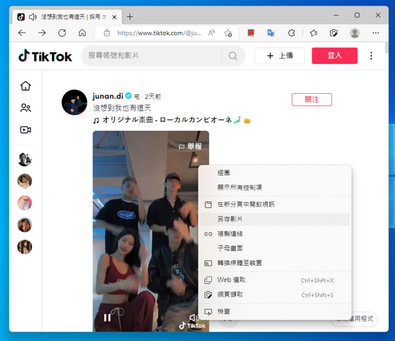 首頁線上工具上傳下載 SSSTIK 輸入 TikTok 影片網址就可選無浮水印的影片或 MP3 下載 想要下載 TikTok 影音平台內的影片,可以直接在影片上方使用滑鼠右鍵點擊叫出快速功能表,使用[ 另存影片 ]的方式就可以下載,當然這種下載方式會有浮水印,如果只想要影片內的配樂也還要額外加工,但 SSSTIK 這個網站全部幫你克服了,其操作步驟很簡單,只需要將 TikTok 影片網址輸入,就可以選擇無浮水印的影片或是影片配樂 MP3 下載,就這麼簡單。 🔔 不錯過任何精彩! 立即訂閱我們的 LINE 官方帳號 每次發佈新文章時,您將會第一時間收到本站文章連結通知,輕鬆掌握最新資訊! 使用 LINE 追蹤文章更新 §相關文章,還可以參閱:M3U8 Player:本地瀏覽器處理,播放、下載、轉 MP4 一站免費完成getM3U8 免費線上工具:輕鬆下載 M3U8 串流影片並轉檔 MP4SnapWC 免費影片下載器:一鍵搞定 YT、IG、FB、抖音等 10,000+ 平台影片、音訊、圖片需要分享圖片連結?試試 PiXhost 免費圖床服務P2PFileShare 線上 P2P 傳檔免費工具,免安裝無檔案大小限制直接瀏覽器傳輸 如何使用 SSSTIK 網站下載 TikTok 影片? 1.使用瀏覽器進入 SSSTIK 網站,將複製好的 TikTok 影片網址貼上後,按[ Download ]。 2.接下來選擇自己想要下載的項目。 3.下載後的影片,可以使用 Windows 內建的影片播放器播放。 4.如果沒有 MP3 或不要浮水印的要求,最簡單的下載方式就是使用滑鼠右鍵在影片上方點擊,利用快速功能表來下載。 SSSTIK網站網址:https://ssstik.io/en