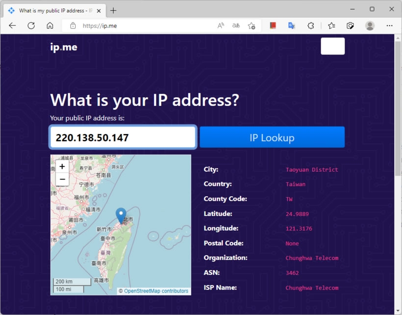 首頁線上工具網路應用 IP.ME 打開網頁立即顯示自己電腦網路連線的 IP 位址 網路問題排查、VPN 接入或程式記錄 IP...等,常常都需要知道自己設備對外的連結 IP,雖然我們可以開啟 Windows 內建的命令提示字元使用 ipconfig指令查詢,但畢竟還是要用指令,略顯繁複,而 IP.ME 這個網站則是方便多了,只要開啟瀏覽器進入該網站,設備所使用的 IP 位址就會立即顯示在網頁上,並提供 ISP 及地理位址等相關資訊,可以說是相當方便。 🔔 不錯過任何精彩! 立即訂閱我們的 LINE 官方帳號 每次發佈新文章時,您將會第一時間收到本站文章連結通知,輕鬆掌握最新資訊! 使用 LINE 追蹤文章更新 §相關文章,還可以參閱:VPNLY 完全免費 VPN 工具,四國 20+ 伺服器免註冊無限流量Flying TTFB:免費網站測速工具!22個全球節點幫你找出網站慢在哪Google URL Shortener (goo.gl) 正式告別, 10個優質短網址替代方案推薦Zero Width Shortener (ZWS):隱形短網址的免費縮網址線上工具LibreSpeed SpeedtestCustom:免費網路速度測試工具,提供遠傳、台灣大哥大、中華、亞太等測試主機 如何使用 IP.ME 查詢設備對外使用的 IP位址? 1.使用 IP.ME 網站查詢設備使用的 IP,僅需使用瀏覽器進入該網站即可。 2.命令提示字元使用 ipconfig /all 查詢。 3.開啟 Windows 設定視窗在[網路和網際網路]中查詢。 IP.ME網站網址:https://ip.me/