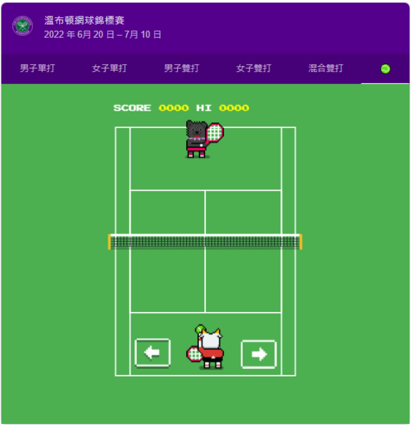 首頁線上工具益智遊戲 Google 搜索「溫布頓網球」關鍵字 就可玩網球對打線上小遊戲 美網、法網、澳網及溫網為網球四大賽事,當中,又以「溫布頓網球公開賽」最有名且最受人關注,而 2022年的溫布頓網球公開賽也正在英國舉行,估計也很難到現場觀看,最多也就是看轉播,真的手癢又沒時間,那就到 Google 搜尋引擎以「溫布頓網球」或「Wimbledon」為關鍵字搜尋,在出現的的賽程表上,我們就可以跟系統來場網球對戰小遊戲。 🔔 不錯過任何精彩! 立即訂閱我們的 LINE 官方帳號 每次發佈新文章時,您將會第一時間收到本站文章連結通知,輕鬆掌握最新資訊! 使用 LINE 追蹤文章更新 §相關文章,還可以參閱:Google Doodle 萬聖節遊戲登場!小精靈 45 週年特別版完整介紹毫秒級反應力大挑戰!用 Reaxon 訓練大腦、眼睛與手的協調反應2048 Cupcakes 經典單人 2048 滑塊線上遊戲,AI 輔助輕鬆挑戰高分免費線上拼圖遊戲平台:iLoveJigsaw 可自行上傳圖片製作拼圖Songlio:線上聽音樂猜歌曲名稱遊戲,可自訂歌曲題庫並與多人一起挑戰 如何在 Chrome 或 Edge 瀏覽器開啟網球對打小遊戲? 1.不論是使用 Edge 或 Chrome 瀏覽器都可以,重點是必須使用 Google 搜尋引擎以「溫布頓網球」或「Wimbledon」為關鍵字搜尋。 2.而不論是 Chrome 或 Edge 最終的搜尋結果都會得到一個賽程表,我們只要點擊賽程表旁邊的綠色圓點就可以開啟網球對打遊戲。 3.操作僅須用到鍵盤的左、右方向鍵即可。 Google 搜尋網站網址:https://www.google.com.tw/