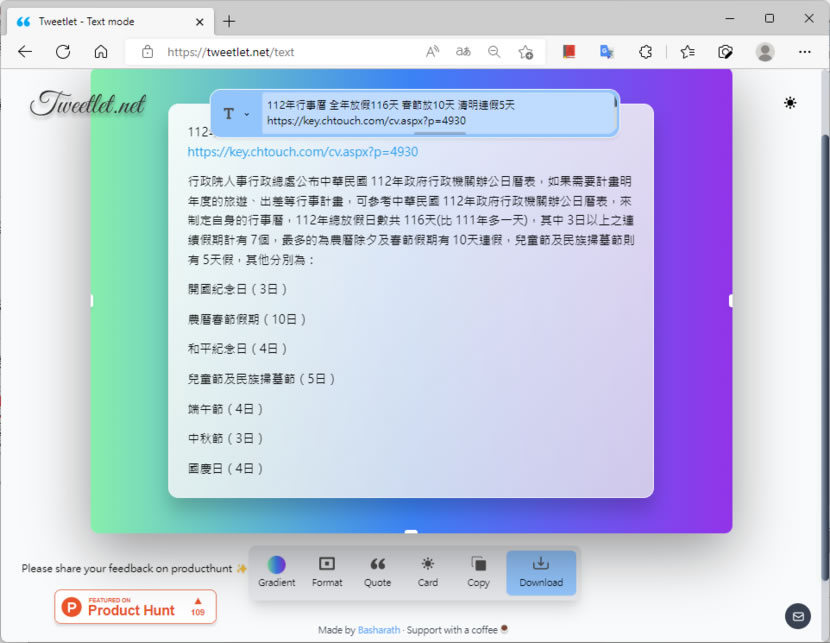 首頁線上工具影像繪圖 Tweetlet 貼上 Tweet URL、圖片或文字轉出帶有漸層背景的圖片 Tweetlet.net 是個具有擷取 Tweet 社群網站網址成圖片、上傳圖片加入背景圖及貼上文字轉成圖片等三項功能的免費網站,背景圖樣式與大小可由使用者自訂或是使用網站所準備的漸層樣式,並下載成 PNG 圖檔格式。 🔔 不錯過任何精彩! 立即訂閱我們的 LINE 官方帳號 每次發佈新文章時,您將會第一時間收到本站文章連結通知,輕鬆掌握最新資訊! 使用 LINE 追蹤文章更新 §相關文章,還可以參閱:Meta AI 免費帳戶也能用 Midjourney!無限生成 AI 圖片,台灣可用Nano Banana Pro 幫你放煙火,地點、形狀由你指定Mock.Club:免費 AI Mockup 素材庫,拖曳截圖立即生成專業展示圖Adobe 官方宣布:Photoshop、Express、Acrobat 免費整合 ChatGPT,免費版也能用3分鐘學會!用 Nano Banana Pro 製作角色服裝分解圖,提示詞複製貼上就能用 如何使用 Tweetlet.net 網站將文字轉成圖片? 1.使用瀏覽器進入 Tweetlet 網站,預設會處在輸入 Tweet網址,可將滑鼠指向下圖紅色箭頭處更換功能。 2.輸入 Tweet網址後,我們可以透過下方功能表改變背景、樣式、背景大小及所要顯示的資訊等。 3.圖片加入背景色,也是相同的操作方式。 4.文字轉圖片也很簡單。 5.完成編輯後,就可以按[ Download ]下載 PNG 圖檔。 Tweetlet.net網站網址:https://tweetlet.net/