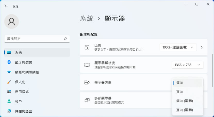 首頁操作技巧Windows 「Windows 11」如何旋轉配合顯示器方向? 電腦螢幕的方向,有時不得不配合環境或應用需求進行調整,如果是使用 Windows 作業系統,我們可以透過顯示設定來調整顯示器方向,其提供橫向、直向、橫向(翻轉)、直向(翻轉)等調整職,讓 Windows 作業系統的呈現能夠符合現在螢幕的方向。 🔔 不錯過任何精彩! 立即訂閱我們的 LINE 官方帳號 每次發佈新文章時,您將會第一時間收到本站文章連結通知,輕鬆掌握最新資訊! 使用 LINE 追蹤文章更新 §相關文章,還可以參閱:你的 Windows 筆電是真睡還是裝睡?一個設定終結背包發熱耗電學起來!微軟親授 10 個提升 Windows PC 效能的技巧如何升級 Windows 11 25H2?最新版本功能亮點與完整更新步驟Windows 工作列時鐘顯示秒數:真的會影響電池續航力嗎?LTT Labs 完整實測解析Windows 快速取出資料夾檔案名稱清單!內建功能輕鬆搞定,不用額外軟體 「Windows 11」如何旋轉配合顯示器方向? 1.滑鼠右鍵按桌面任一空白處叫出快速功能表 > [ 顯示設定 ]。 2.找到[ 顯示器方向 ]進行調整。