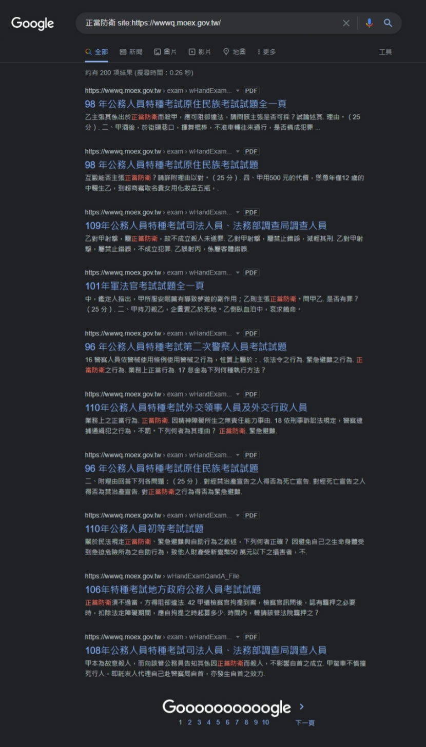 3.觀察到上圖所使用的搜尋字串是 正當防衛 site:https://wwwq.moex.gov.tw/ ,接下來我們就可以依此類推,改變要查詢的關鍵字,例如: