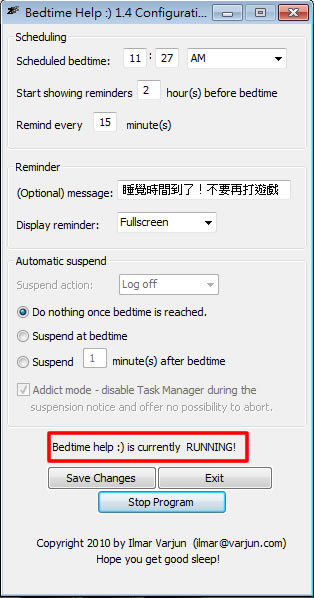 首頁電腦軟體系統應用 Bedtime Help :) 就寢時間提醒或直接將電腦登出、休眠或關機工具 不管是使用電腦來工作、遊戲或找資料,若常常會忘了時間,可以透過 Bedtime Help :) 這套免費的軟體來提醒,雖然作者的目的是用來提醒就寢的時間,但對於時間到須提醒的事項、排程自動關機、登出或休眠,均可以使用 Bedtime Help :) ,應用其實還滿多的。 🔔 不錯過任何精彩! 立即訂閱我們的 LINE 官方帳號 每次發佈新文章時,您將會第一時間收到本站文章連結通知,輕鬆掌握最新資訊! 使用 LINE 追蹤文章更新 §相關文章,還可以參閱:CatLock:可鎖定鍵盤的 Windows 應用程式,防止寵物意外觸碰Zen Ad blocker 瀏覽器與應用程式均適用的廣告攔截器,免費且開放原始碼TimVer 一站式顯示 Windows 版本及電腦硬體相關訊息的工具「微軟電腦管家」內含開機啟動項目管理、儲存空間最佳化等免費工具 全方位提升電腦效能Windows Startup Timer 測量 Windows 從開機到完全啟動所需時間 如何使用 Bedtime Help :)? 1.下載安裝,開啟「Bedtime Help :) 」後,就可以開始對其進行設定。 2.設定好之後,先點擊[Save Changes]儲存設定值,若要開始啟用可點擊[Start Program],啟用後會顯示 Bedtime Help :) is currently RUNNING!! 3.時間到,便開始執行所設定的動作。 Bedtime Help :)版本:1.4語言:英文性質:免費適用:Windows官方網站:http://varjun.com/bedtime/下載:按我下載