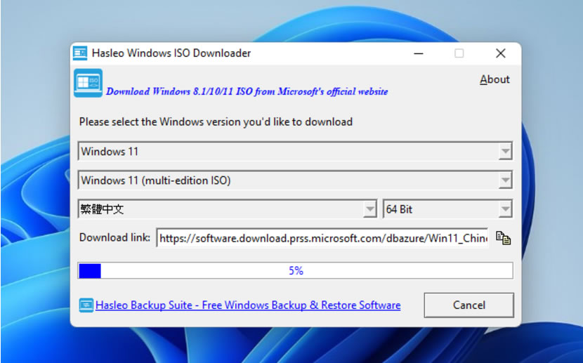首頁電腦軟體上傳下載 Hasleo Windows ISO 快速下載 Windows 11/10/8.1 ISO 檔的免費工具 Hasleo Windows ISO Downloader 是一個可以幫助我們從微軟官網下載 Windows 11/10/8.1 ISO 檔的免費且免安裝應用程式,使用方式很簡單,開啟該應用程式後,選擇所要作業系統版本及語系便可以開始下載,相當方便。 🔔 不錯過任何精彩! 立即訂閱我們的 LINE 官方帳號 每次發佈新文章時,您將會第一時間收到本站文章連結通知,輕鬆掌握最新資訊! 使用 LINE 追蹤文章更新 §相關文章,還可以參閱:ArrowDL 全平台下載利器:輕鬆批量下載 YouTube、BT、FB與多站串流影片YouTubePlaylistDownloader 支援播放清單與頻道的 YouTube 影片下載工具,還能轉換格式Parabolic 讓 yt-dlp 更好用的免費影音下載工具,支援上千個網站的影音下載Hasleo Windows ISO Downloader 幫你從微軟網站下載原版 Windows ISO 檔XMusicDownloader 從音樂網站搜尋並下載歌曲的免費應用程式 如何使用 Hasleo Windows ISO 下載 Windows 11/10/8.1 ISO 安裝檔? 1.解壓縮下載的檔案,可自選執行 x86 或 x64 資料夾內的[ WinISODownloader.exe ]執行檔。 2.開啟後,選擇 Windows 11/10 或 8.1 下載。 3.可按需求自行變更語系等參數。 4.最後,按[ Download ]按鈕開始下載。 Hasleo Windows ISO語言:英文性質:免費官方網站:https://www.easyuefi.com/windows-iso-downloader/windows-iso-downloader.html下載:按我前往官方網站下載