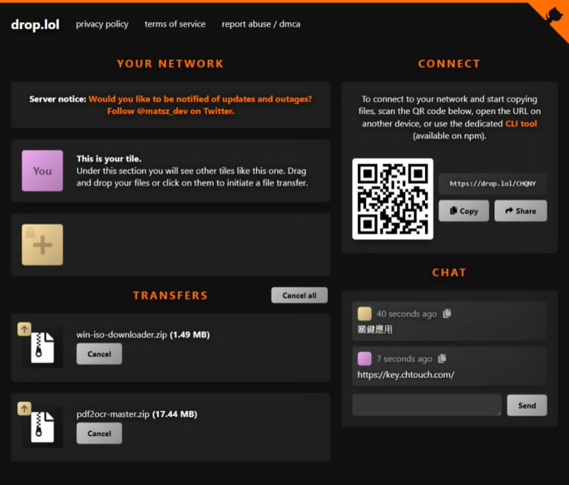 首頁線上工具上傳下載 drop.lol 使用瀏覽器就能互傳檔案的免費服務 不論是要手機電腦互傳檔案、兩台電腦互傳檔案或是手機互傳檔案,只要裝置內有瀏覽器的就可以來使用 drop.lol 這個網站所提供的檔案互傳免費服務,該服務的使用方式很簡單,不論誰先起頭,就會得到一個獨立網址,透過該網址就可以邀請要互傳檔案的裝置進入,就像是個獨立的包房,在內成員可以無限制傳送檔案,也可以傳送文字訊息,而當該網頁被關閉後,所有的連結也會一併失效,保障檔案安全性。 🔔 不錯過任何精彩! 立即訂閱我們的 LINE 官方帳號 每次發佈新文章時,您將會第一時間收到本站文章連結通知,輕鬆掌握最新資訊! 使用 LINE 追蹤文章更新 §相關文章,還可以參閱:M3U8 Player:本地瀏覽器處理,播放、下載、轉 MP4 一站免費完成getM3U8 免費線上工具:輕鬆下載 M3U8 串流影片並轉檔 MP4SnapWC 免費影片下載器:一鍵搞定 YT、IG、FB、抖音等 10,000+ 平台影片、音訊、圖片需要分享圖片連結?試試 PiXhost 免費圖床服務P2PFileShare 線上 P2P 傳檔免費工具,免安裝無檔案大小限制直接瀏覽器傳輸 如何使用 drop.lol 網站傳送檔案? 1.使用瀏覽器進入 drop.lol 網站,初次進入會有個使用說明。 2.按[ Continue ]按鈕關閉該說明後,就會產生一個獨一無二的 QR Code網址,有了這個網址就可以邀請要互傳檔案的裝置加入。 3.其他裝置同樣開啟瀏覽器掃描 QR Code 或自行輸入網址進入。 4.按+ 便可以加入要傳送的檔案,右下角的 Chat 處,還可以傳送文字訊息。 drop.lol網站網址:https://drop.lol/