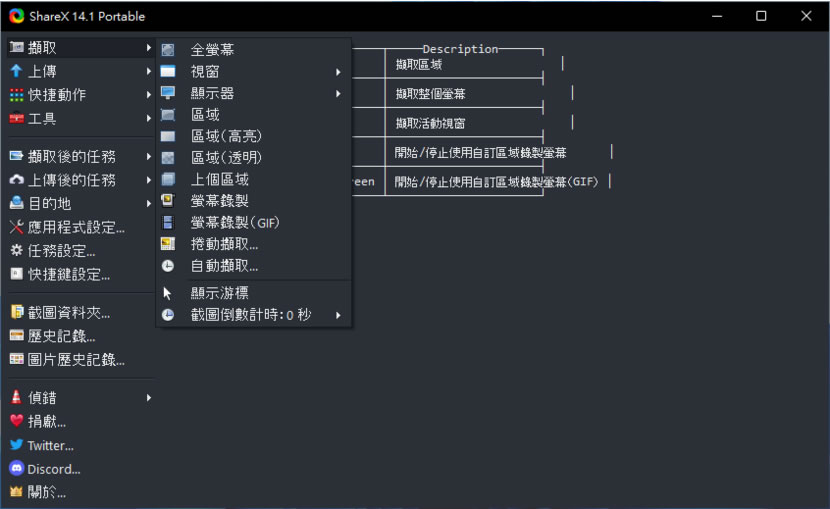 2.完成語言變更,重新啟動 ShareX 後,便可開始使用擷取內的全螢幕截圖、視窗截圖、區域截圖、螢幕錄製(mp4)、螢幕錄製(GIF)、文字擷取(OCR)、捲動擷取長圖片…等各項功能。