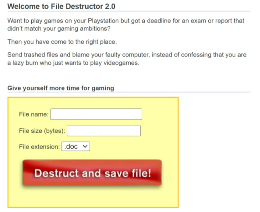 首頁線上工具生產力工具 File Destructor 線上產生無法開啟的 Word、PowerPoint 及 Excel 等各類檔案 報告交不出的情況有很多,但沒做、做不完、遺失跟有做但檔案損壞無法開啟,雖然都是交不出來的情況,但事後的命運應該也會各有不同,要產生可以拖延時間的檔案不難,只要到 File Destructor 這個免費網站就可以輕鬆產生 doc、txt、zip、ppt、 img、xls、jpg、pdf、bmp、gif、htm、rtf、sit、eps、mpg、mp3、mov、swf、psd、png、fla 及 pps 等各種類型的檔案且是無法開啟的檔案,其使用方式很簡單,僅需輸入檔案名稱,檔案大小,再輸入所要的副檔名,無須註冊,立刻就可以產生。 🔔 不錯過任何精彩! 立即訂閱我們的 LINE 官方帳號 每次發佈新文章時,您將會第一時間收到本站文章連結通知,輕鬆掌握最新資訊! 使用 LINE 追蹤文章更新 §相關文章,還可以參閱:Google AI Plus 降到 260 元對決 ChatGPT Go!誰的功能更值得訂閱?ChatGPT Go 月付 290 元值得嗎?免費版、Plus 完整比較用 AI 做出的電影,YouTube 就看得到!一起來欣賞這部贏得百萬美元的突尼西亞短片《Lily》Apple Creator Studio 來了:Final Cut Pro、Logic Pro 等九款 App 月付 390 元,學生優惠僅 90 元ChatGPT 智慧購物功能登台!台灣用戶也能用 AI 做商品研究與比價 如何使用 File Destructor 產生無法開啟的 Word、PowerPoint 及 Excel? 1.使用瀏覽器進入 File Destructor 網站,輸入檔名、要產生的檔案大小後,選擇所要的檔案類型。 2.確定後按[ Destruct and save file! ]按鈕,就會進行處理與下載,而開啟該檔案就會出現如下圖的錯誤訊息。 File Destructor網站網址:https://www.xnet.se/fd/
