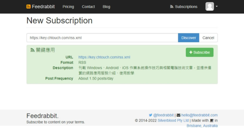 1.進入 Feedrabbit 網站,輸入要訂閱的網站網址,例如本站https://chtouch.com/rss後,按[ Subscribe ]按鈕。